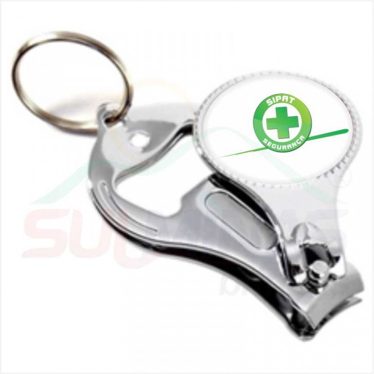 Chaveiro de metal banhado em niquel;Impressão em etiqueta auto - adesiva com acabamento em resina epoxi ou PU