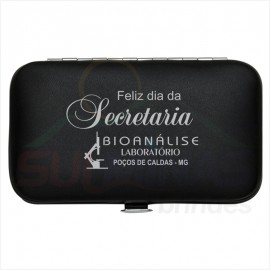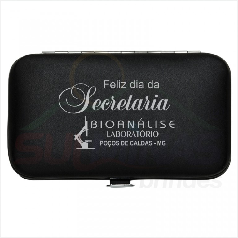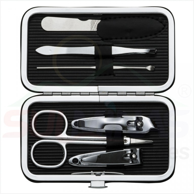 Kit manicure 6 peças em estojo de couro sintético. Possui: lixa, pinça, empurrador de cutícula, cortador de cutícula, tesoura e cortador de unha. Parte interna de plástico com suporte de couro para fixar as peças. Para abrir o estojo basta apertar o botão central.