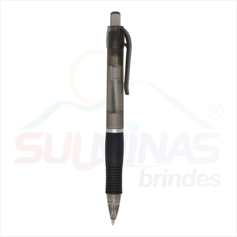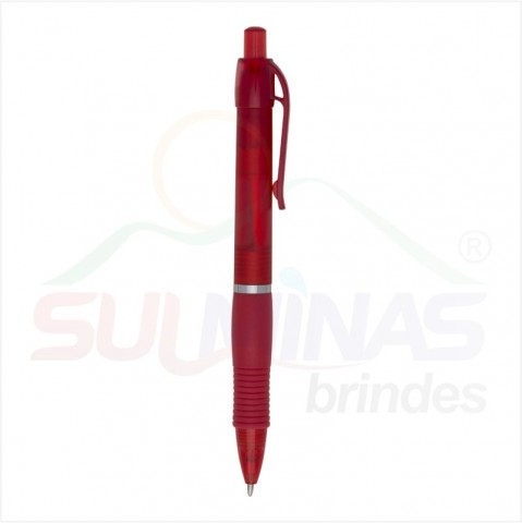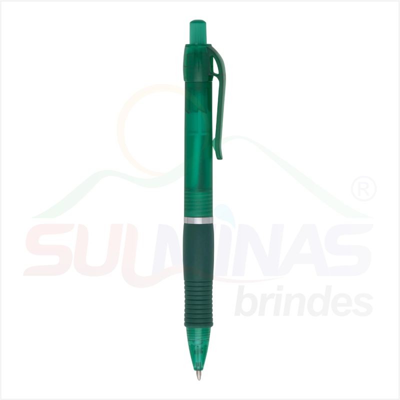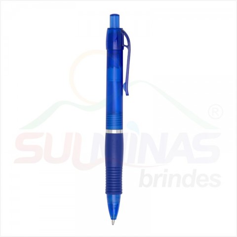 Caneta plástica inteira colorida com anel prata. Possui corpo translúcido e parte inferior emborrachada com relevo. Aciona por clique.