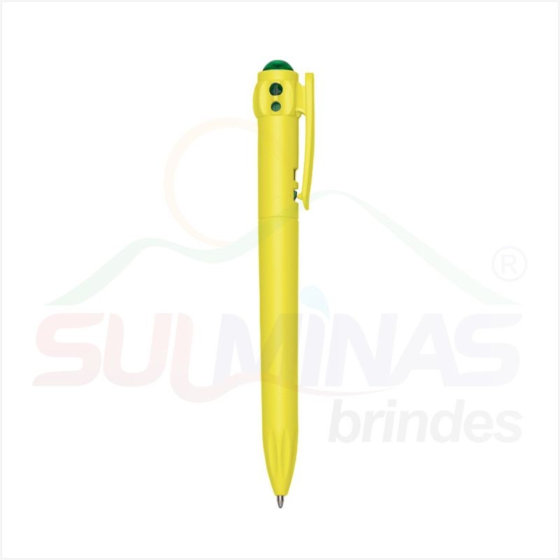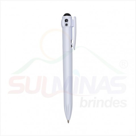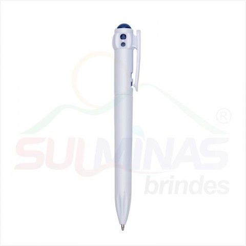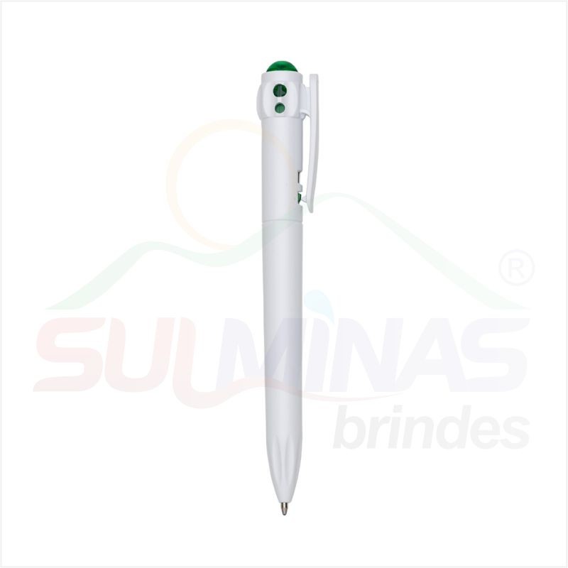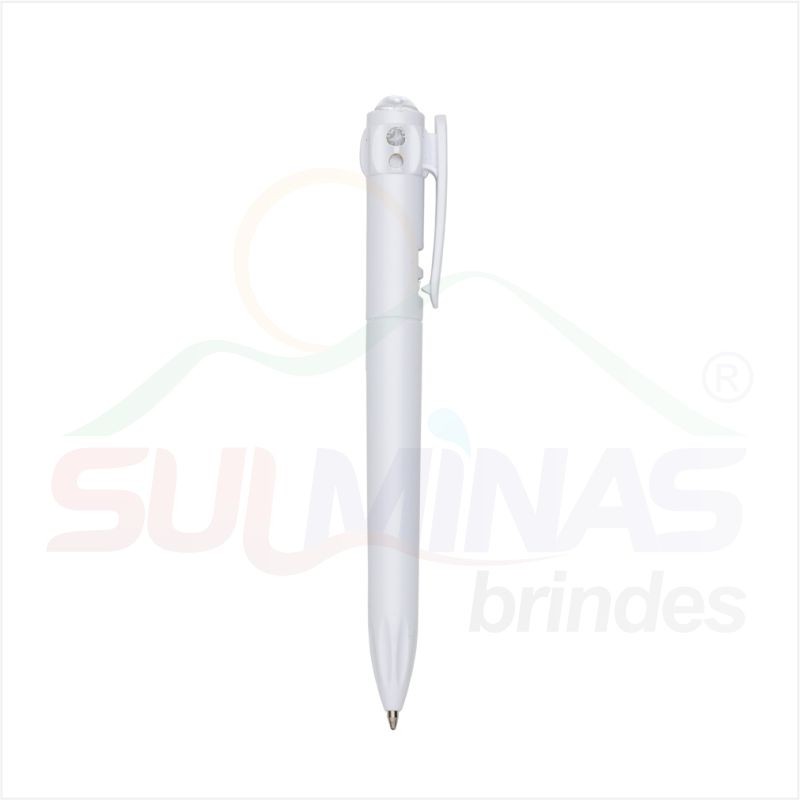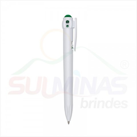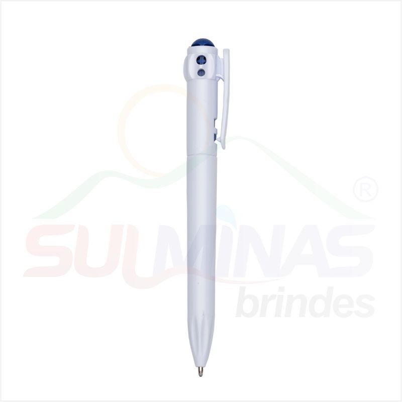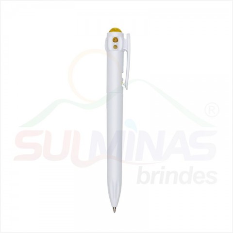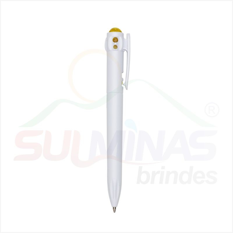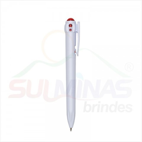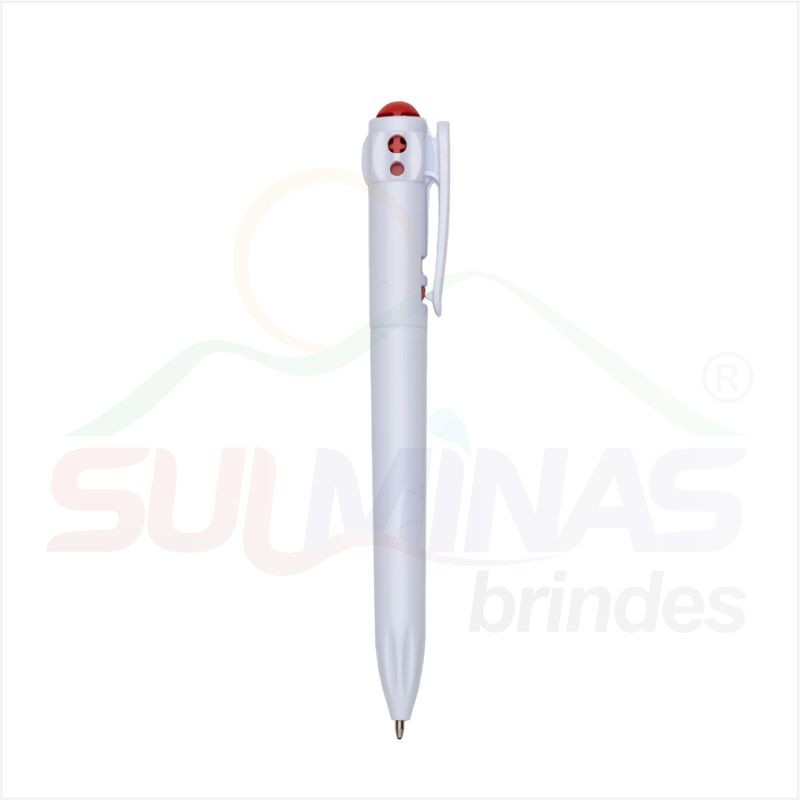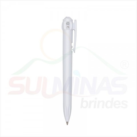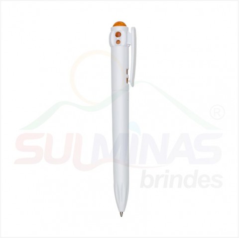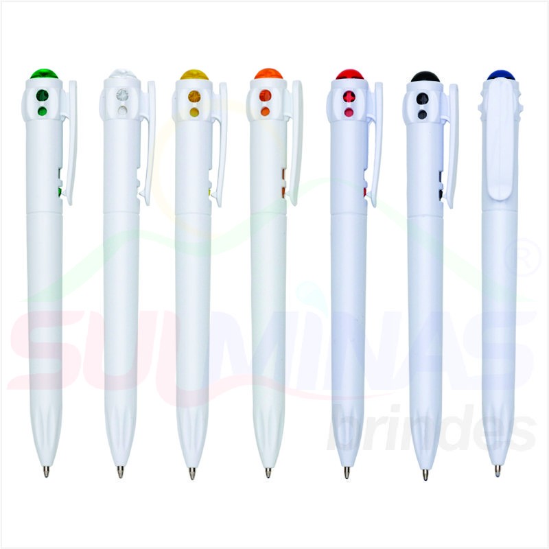 Caneta plástica inteira branca com acionador colorido em relevo. Suporte do clip com dois furos em cada lateral e detalhe em relevo, possui anel “vazado” abaixo do clip e detalhes na parte inferior em relevo. Aciona por clique e destrava apertando a parte inferior do clip.
