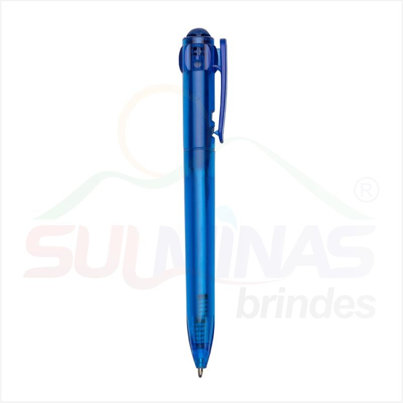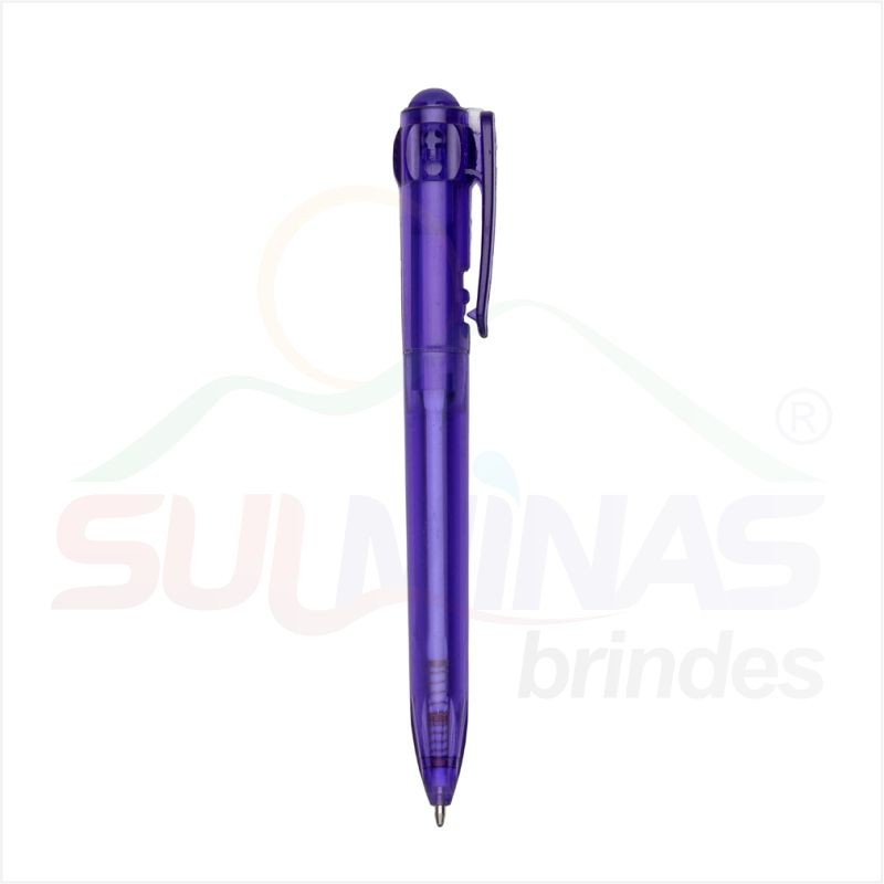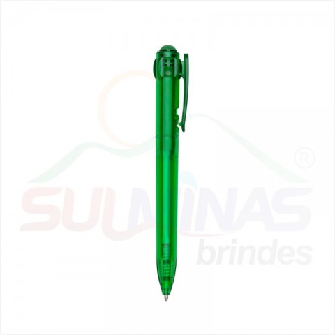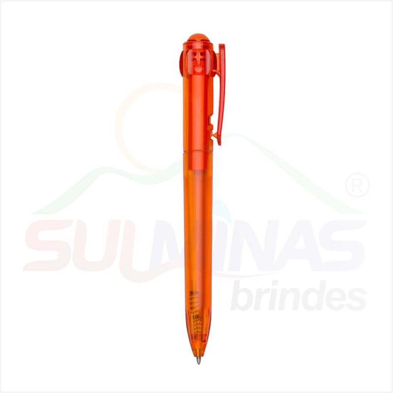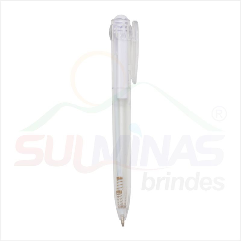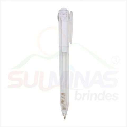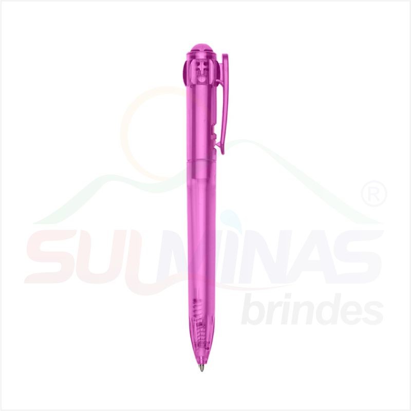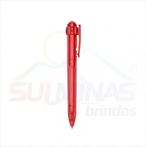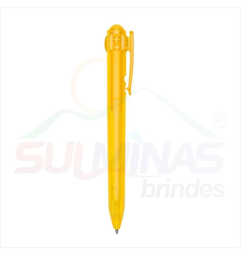 Caneta plástica translúcida inteira colorida com acionador em relevo. Suporte do clip com dois furos em cada lateral e detalhe em relevo, possui anel “vazado” abaixo do clip e detalhes na parte inferior em relevo. Aciona por clique e destrava apertando a parte inferior do clip.