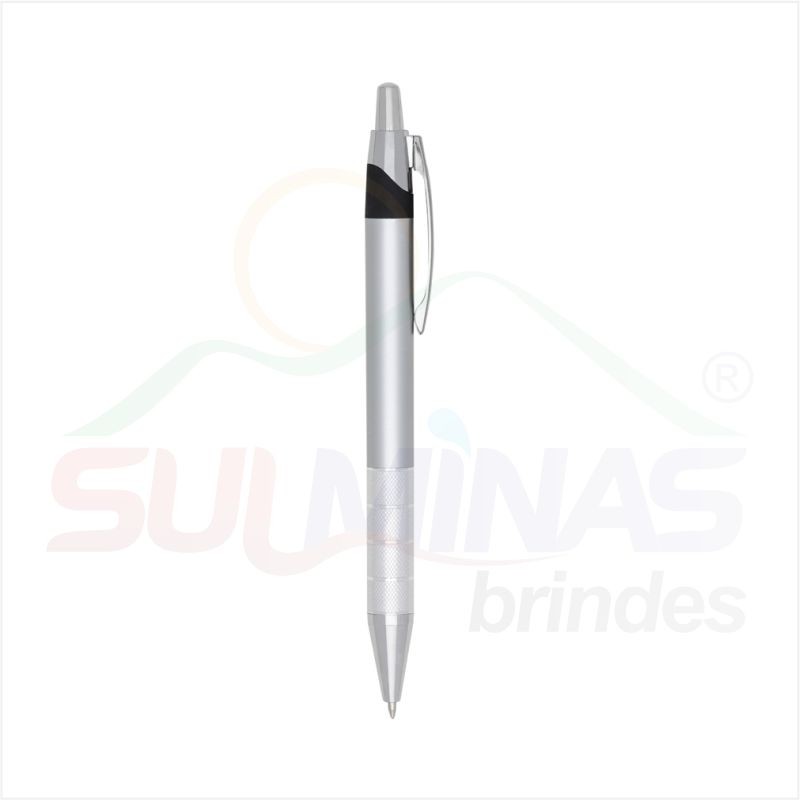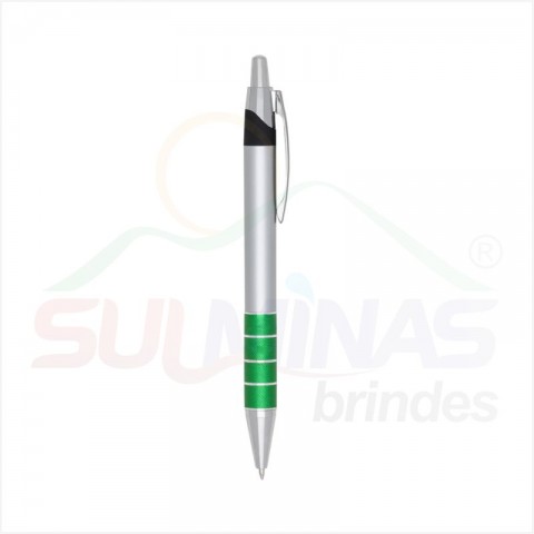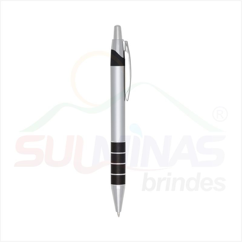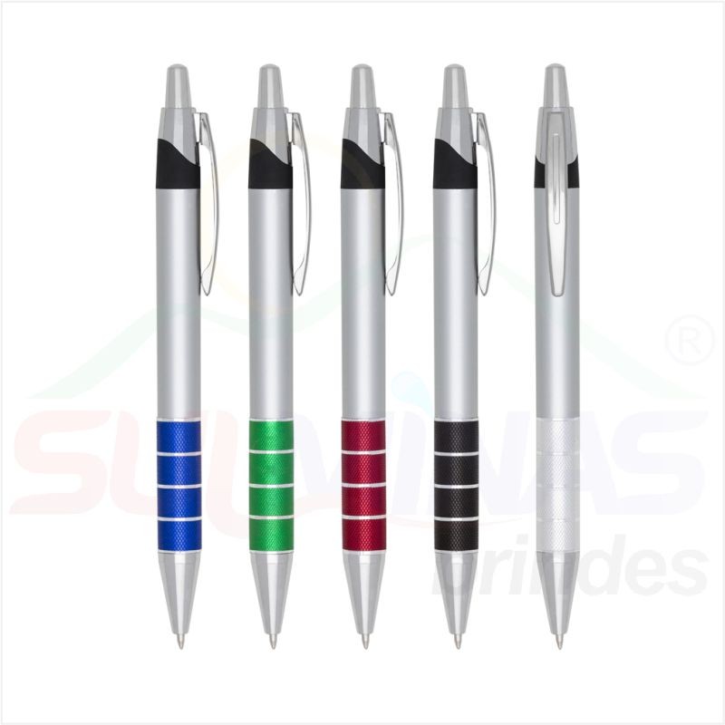 Caneta plástica prata com detalhes coloridos. Possui clip de metal e ao lado design com detalhe preto, quatro anéis coloridos com relevo, aciona por clique.