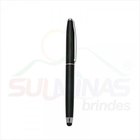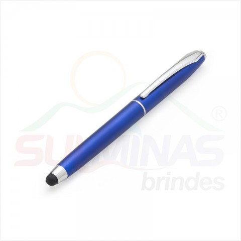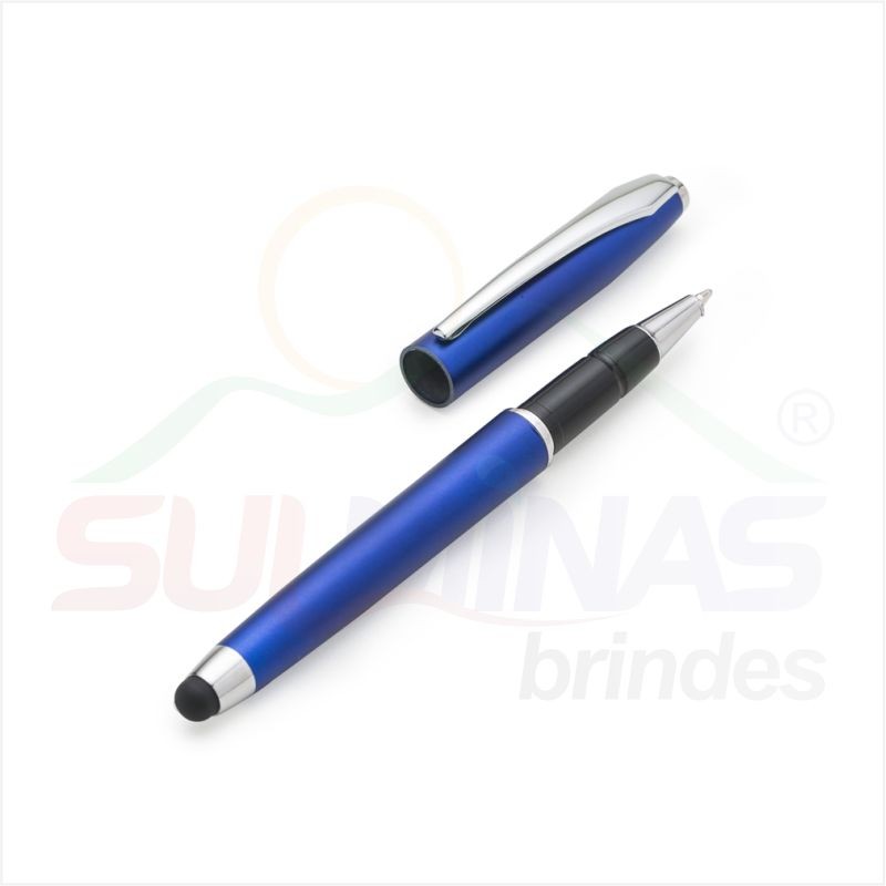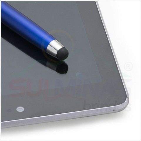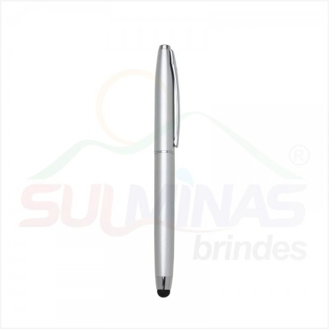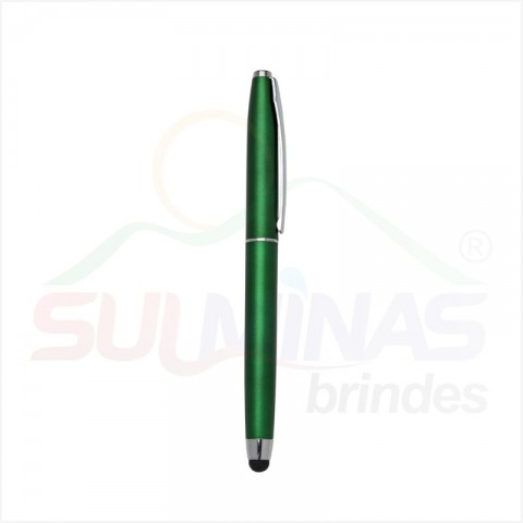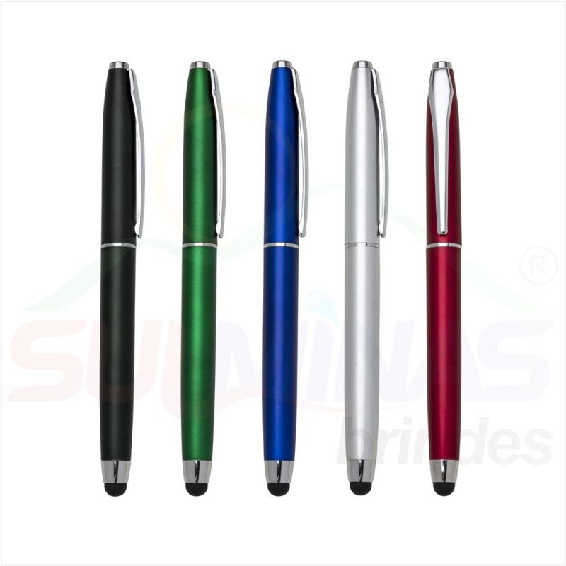Caneta plástica touch inteira colorida com detalhes em prata. Possui tampa e clip de metal, anéis: superior, central e inferior em prata. Para utilizar esferográfica basta tirar a tampa, touch fica do lado oposto.
