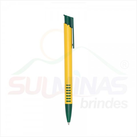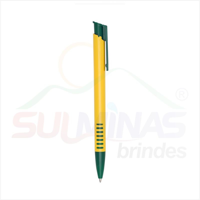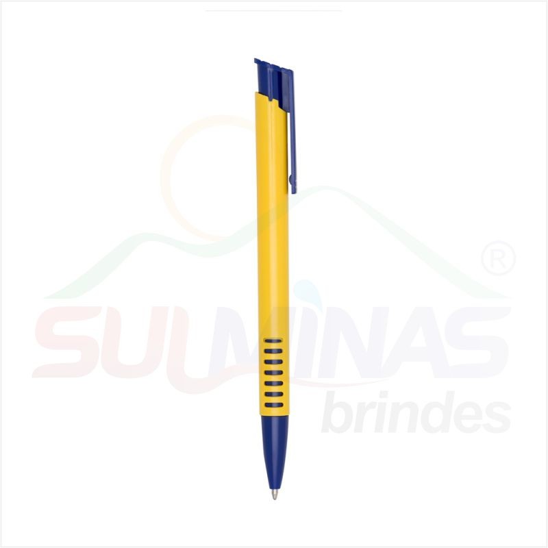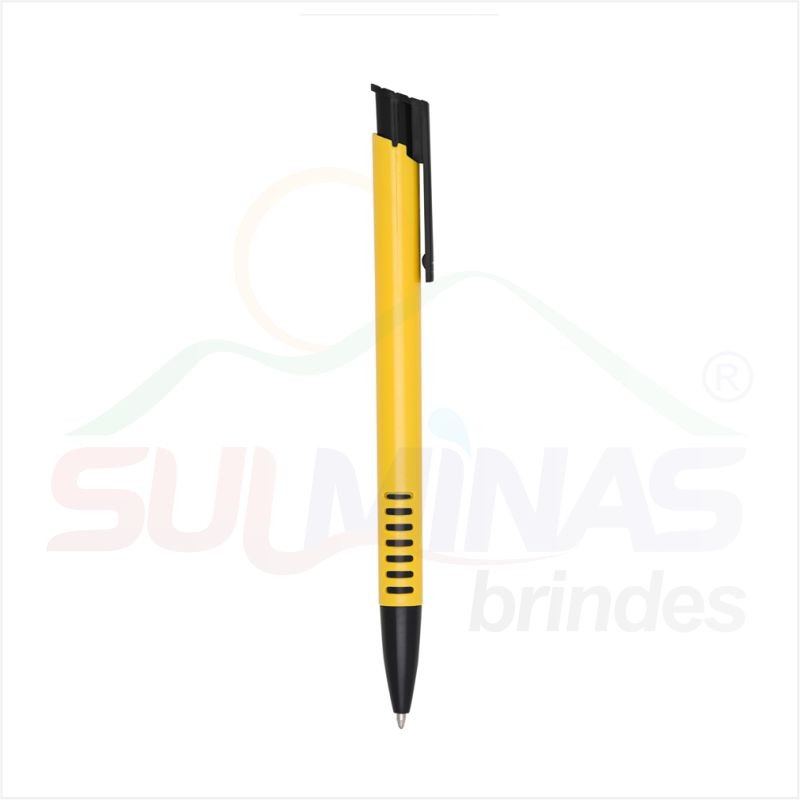 Caneta plástica corpo amarelo com detalhes coloridos. Clip plástico colorido e parte inferior com sete linhas coloridas. Aciona por clique.