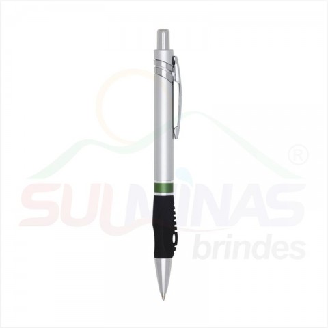 Caneta plástica inteira prata com detalhes em colorido. Clip de metal, possui anel colorido e parte inferior emborrachada com relevo. Aciona por clique.