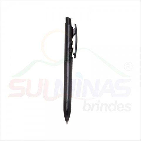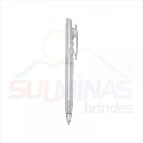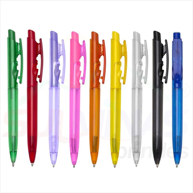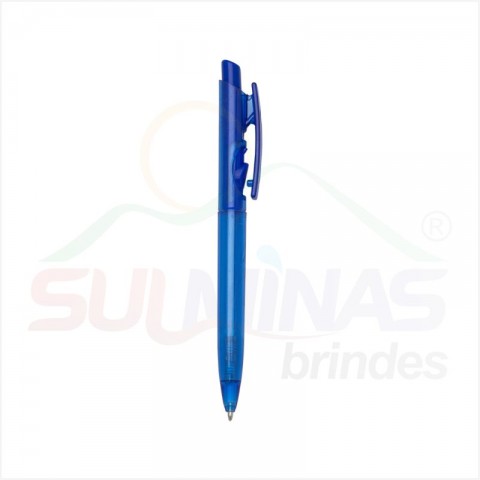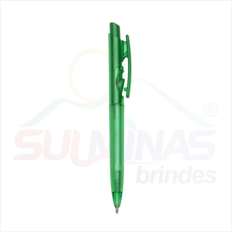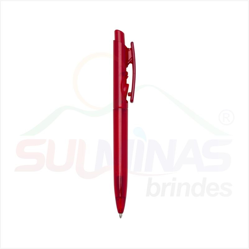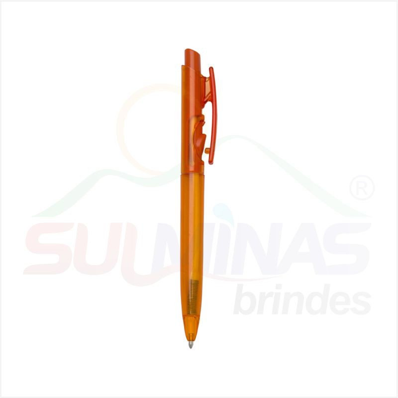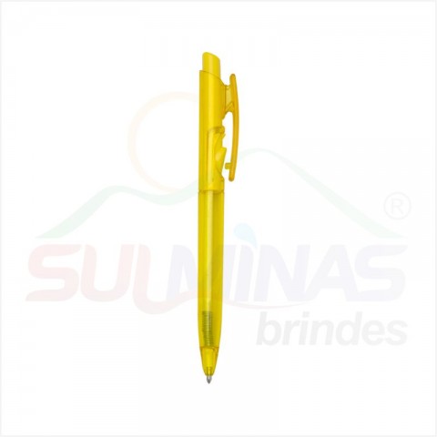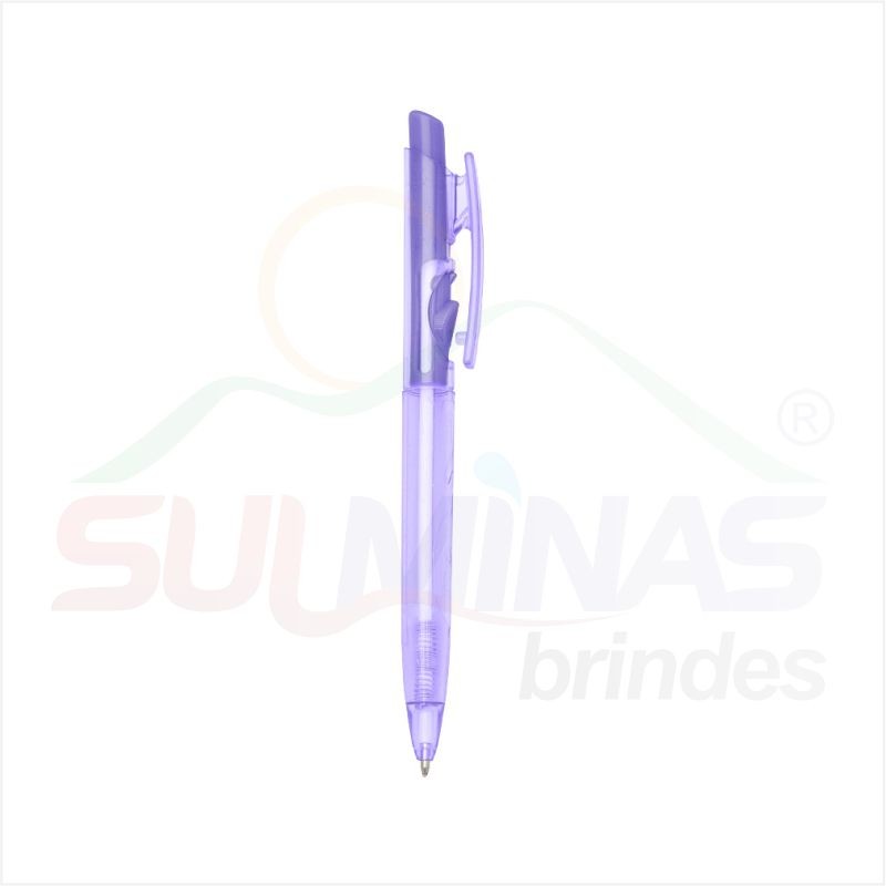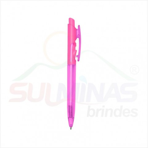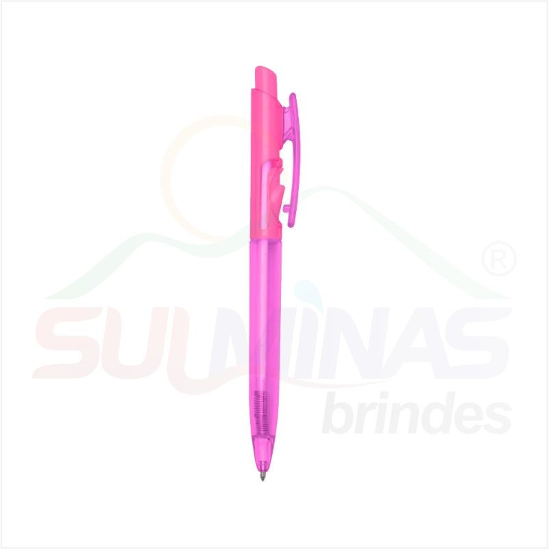 Caneta plástica translúcida inteira colorida. Aciona por clique e para destravar basta apertar a parte inferior do clip.