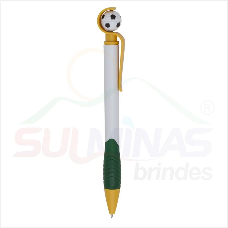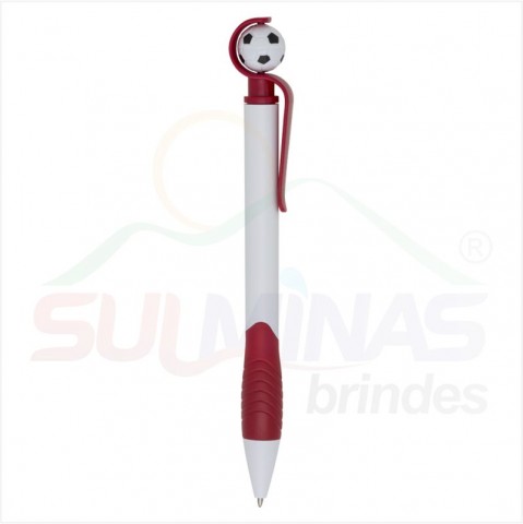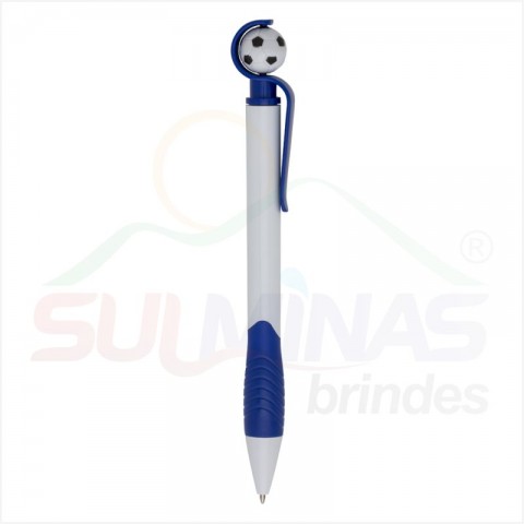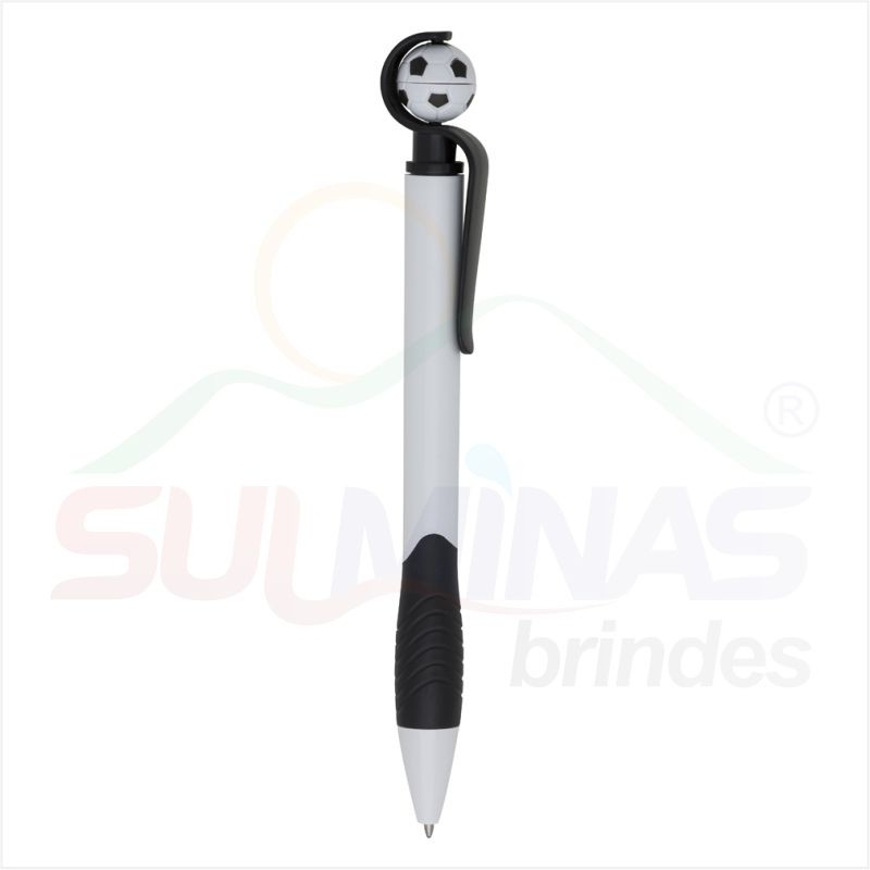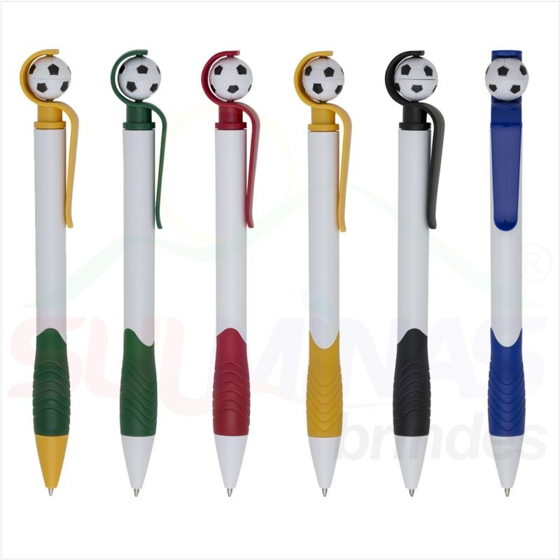 Caneta plástica branca com detalhes coloridos. Possui bola de futebol no clip (removível), parte inferior emborrachada com relevo. Aciona por giro.