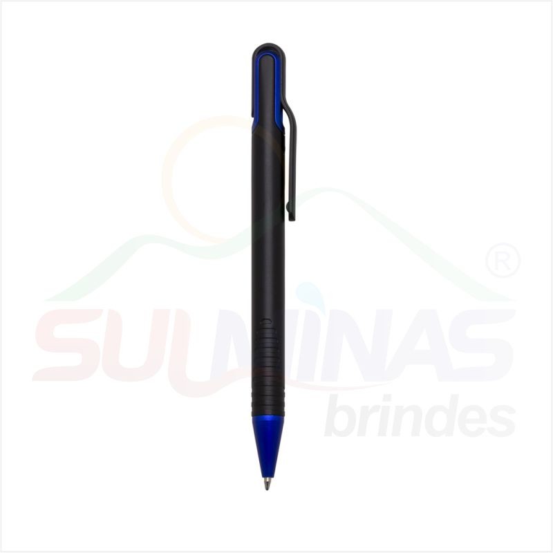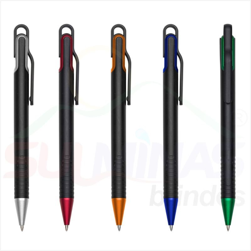 Caneta plástica corpo prata com detalhes coloridos. Clip plástico colorido e parte inferior com sete linhas coloridas. Aciona por clique.
