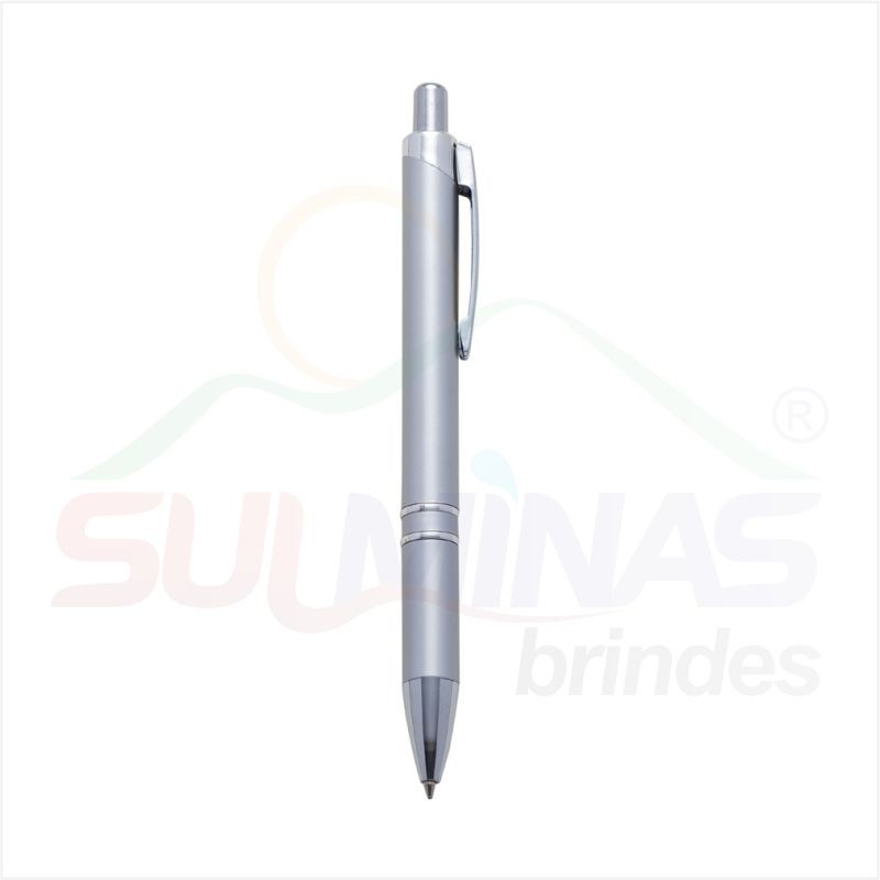 Caneta plástica inteira colorida com detalhes prata. Clip metal, possui dois anéis prata inferior. Aciona por clique.