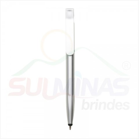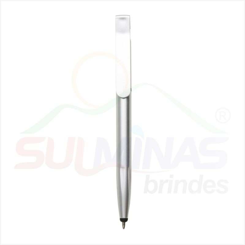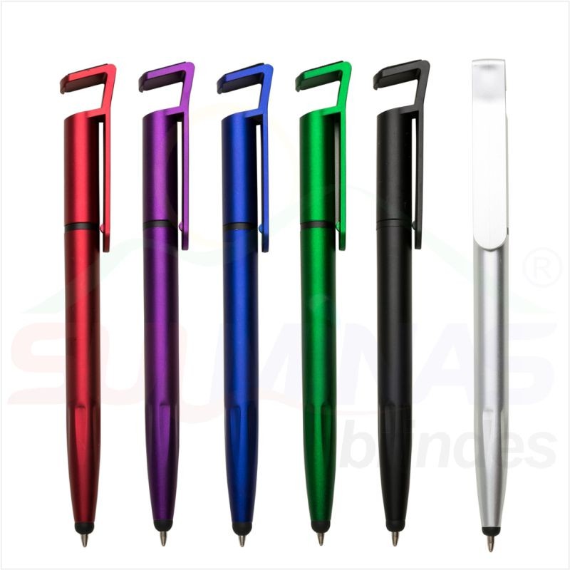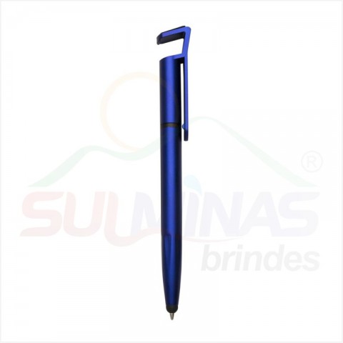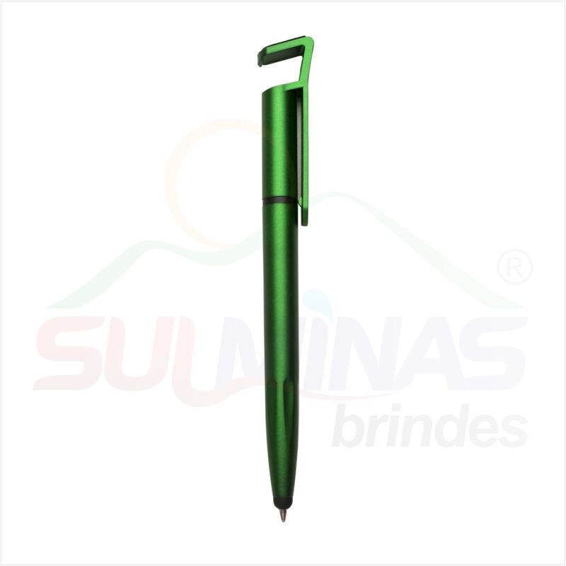 Caneta plástica touch com suporte para celular, caneta inteira colorida com detalhes preto. Clip plástico aberto utilizado como suporte para o celular e parte superior com limpador de tela, possui anel preto abaixo do clip e parte inferior com detalhes em relevo. Aciona por giro.