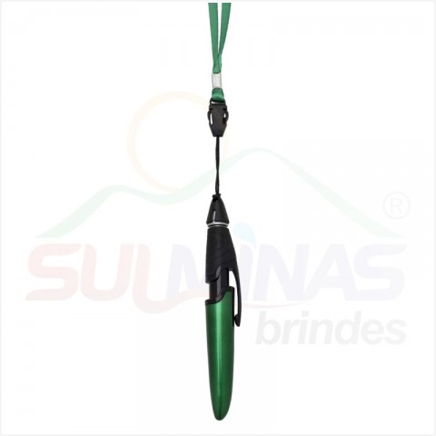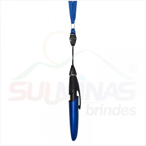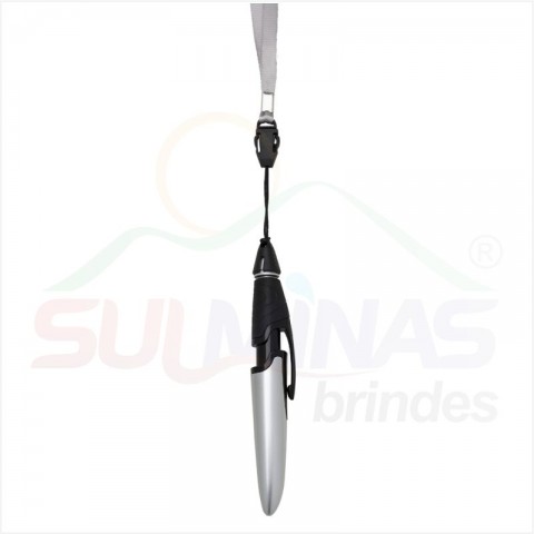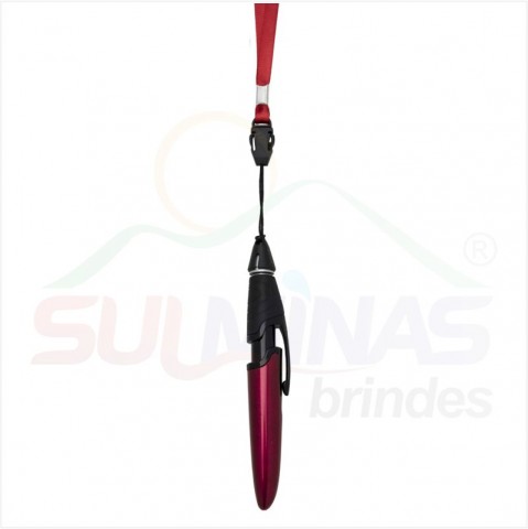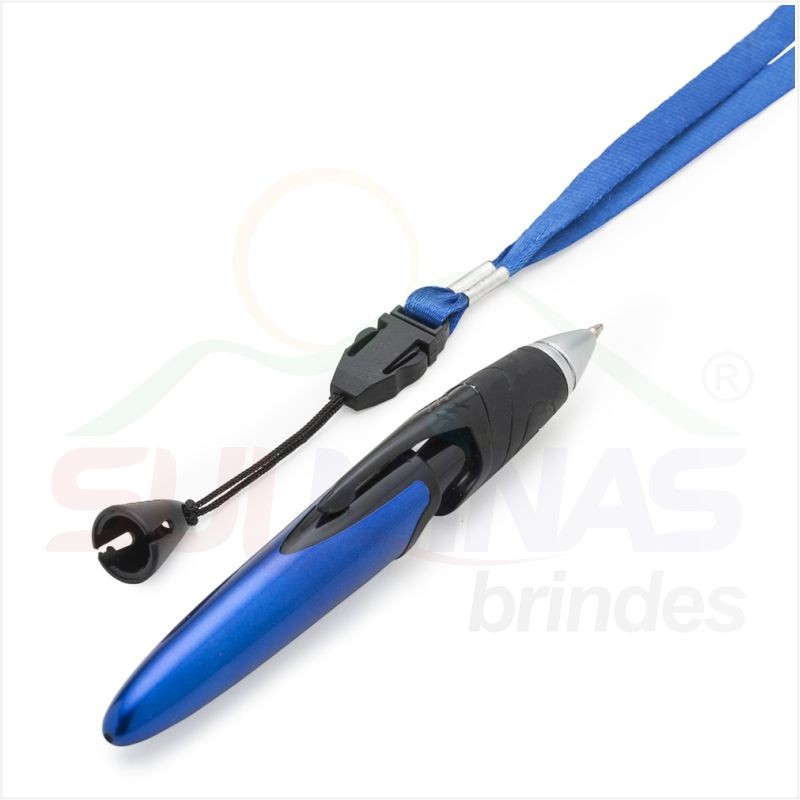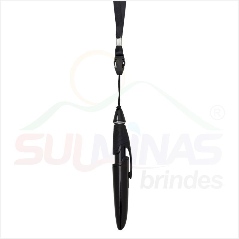 Caneta plástica colorida com cordão. Possui o corpo colorido com clip plástico preto, detalhe preto emborrachado com relevo e tampa protetora preta. Aciona por clique.