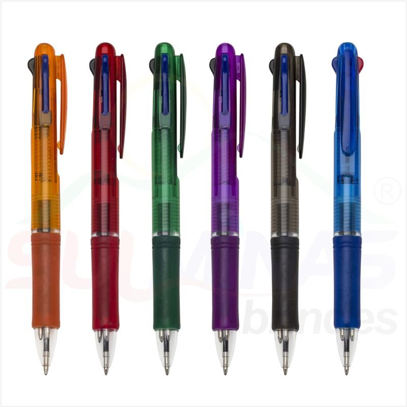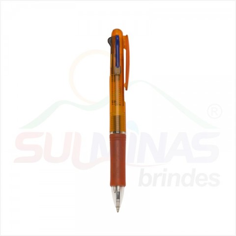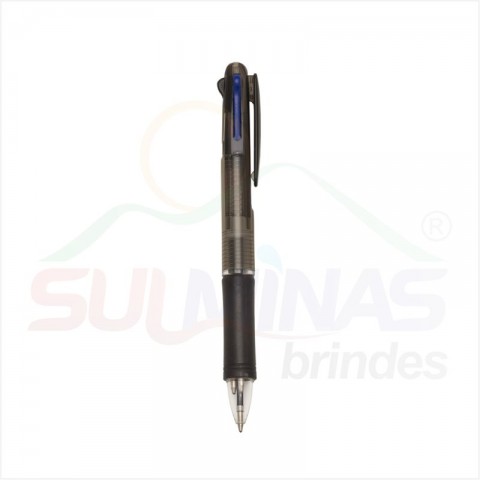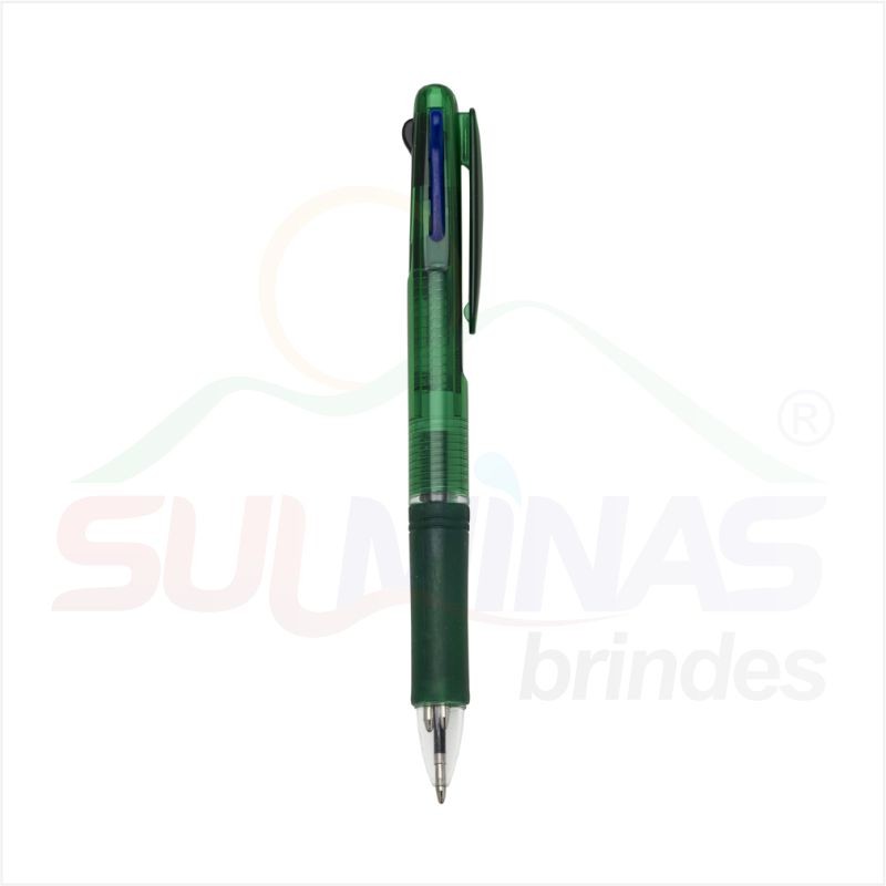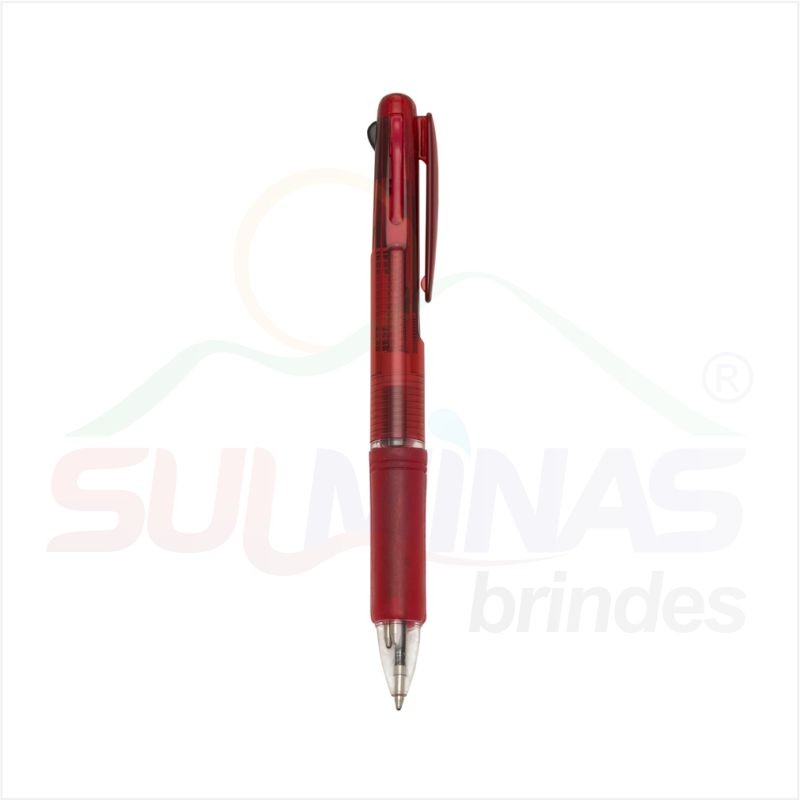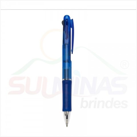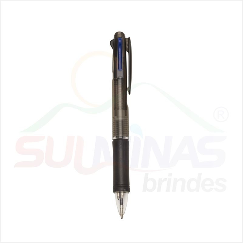 Caneta plástica de 3 cores(cargas: azul, preto e vermelho) inteira colorida com anel inferior e borracha colorida. Para acionar a cor desejada basta “descer o botão” com a cor respectiva, para destravar basta apertar pressionar outra cor.
