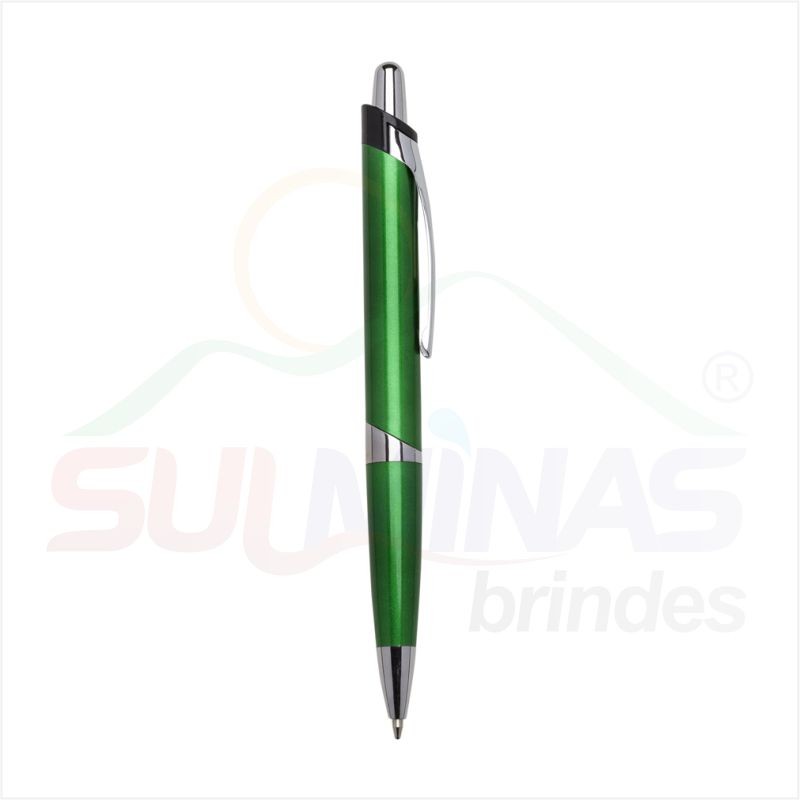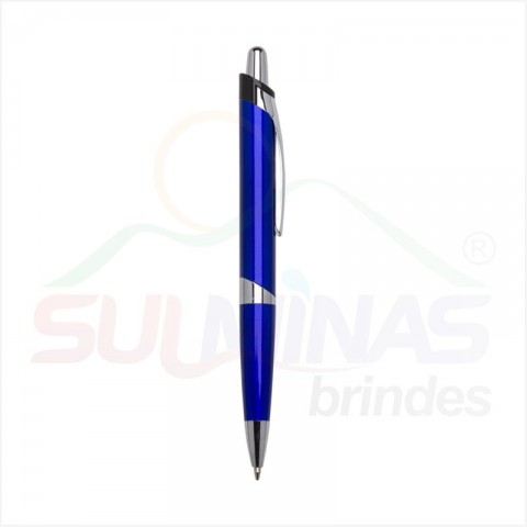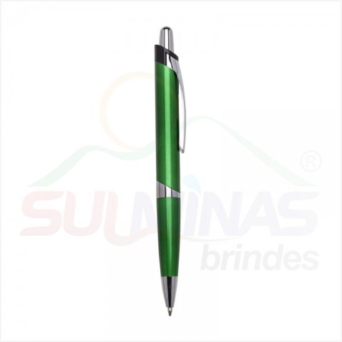 Caneta plástica inteira prata com detalhes coloridos. Possui clip de metal com um furo e um traço vazado, suporte do acionador preto e anel central prata. Aciona por clique.