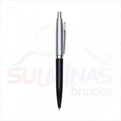 Caneta plástica prata com detalhe colorido. Clip plástico, possui anel central com detalhes em relevo. Aciona por clique.