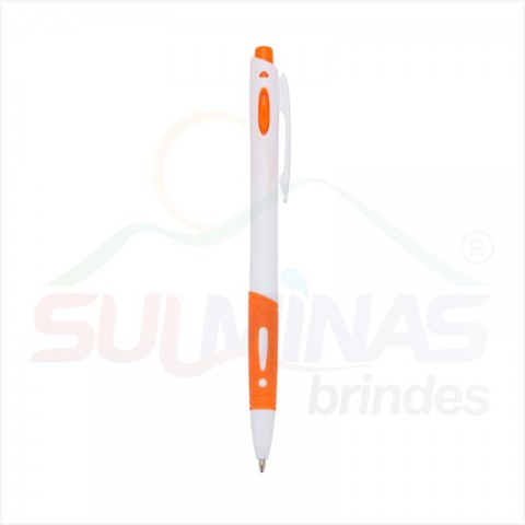 Caneta plástica com detalhes coloridos e parte inferior emborrachado com relevo. Aciona por clique e destrava apertando o “botão” na lateral do clip.