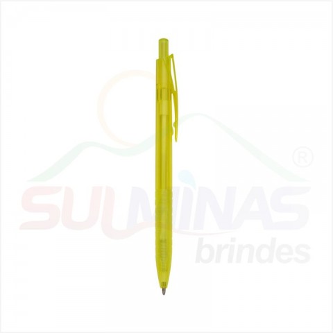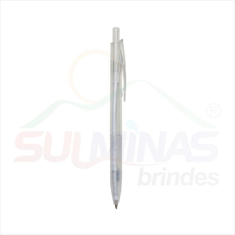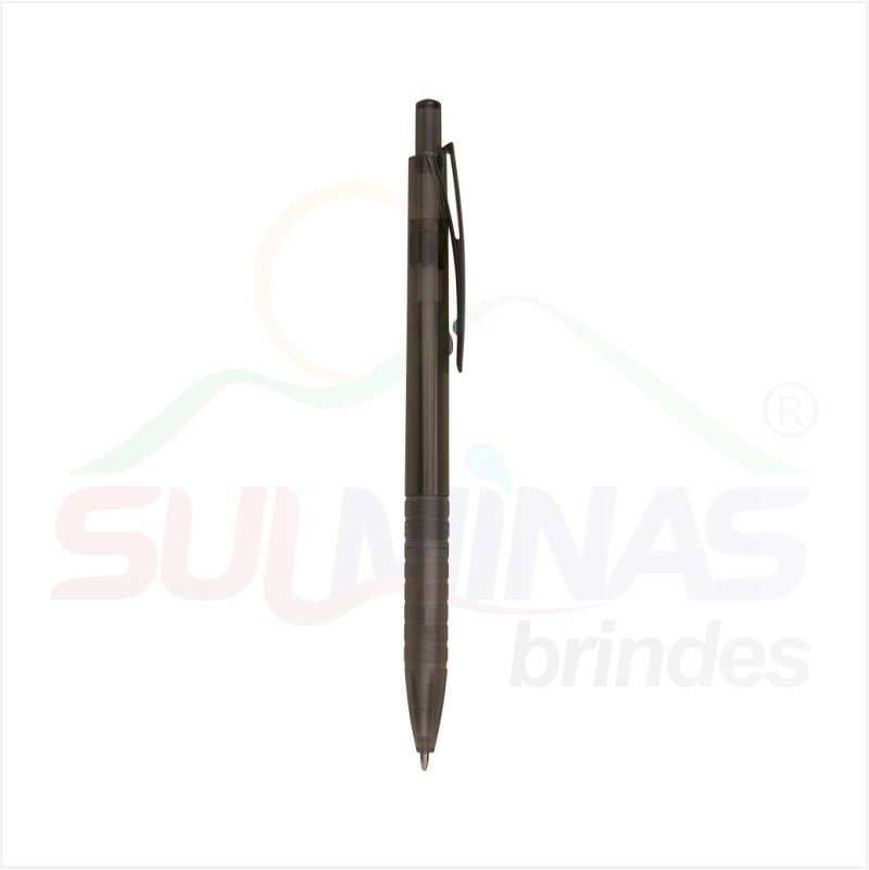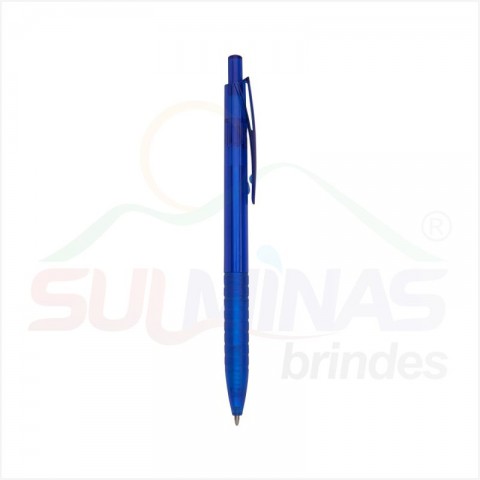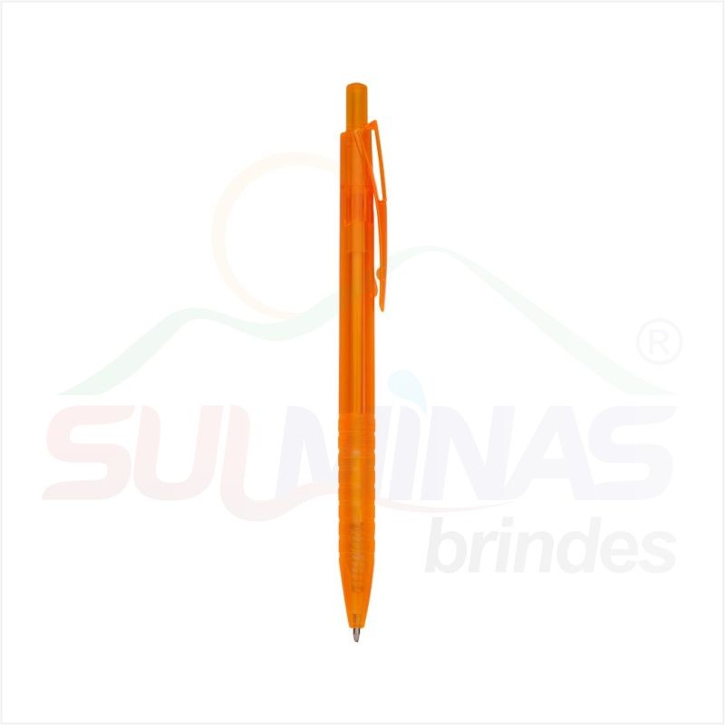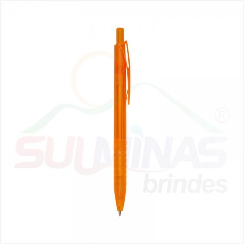 Caneta plástica translúcida inteira colorida. Clip plástico com detalhe vazado nas laterais, acionador e parte inferior preta com oito anéis em relevo. Aciona por clique.