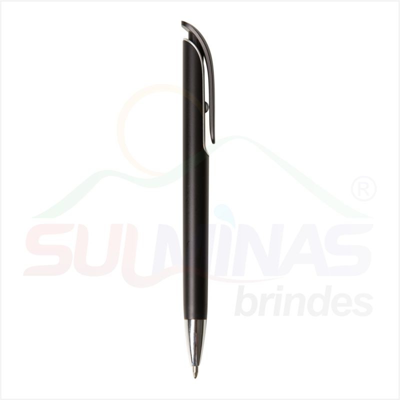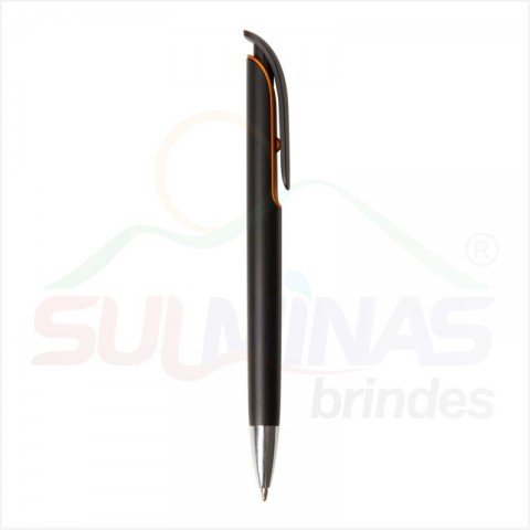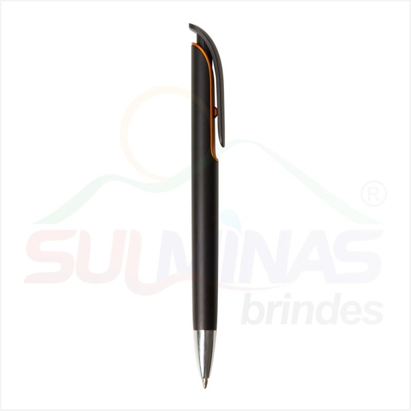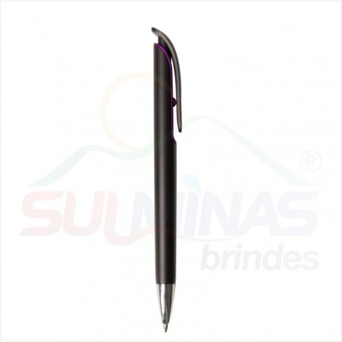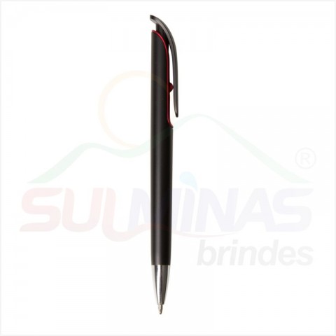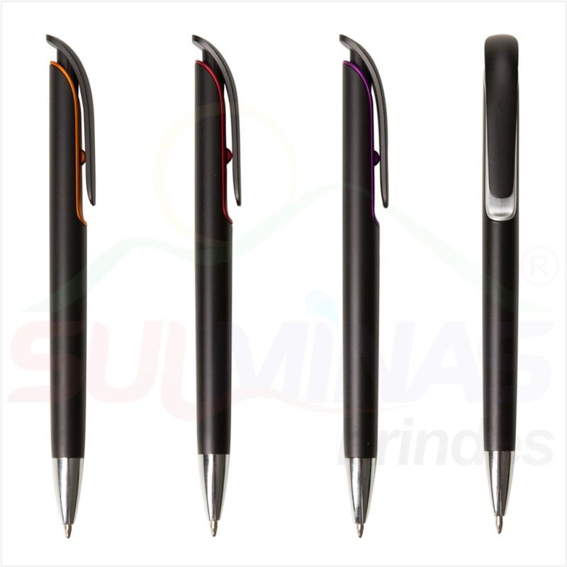 Caneta plástica na cor preto fosco com detalhe colorido ao redor do clip, ponteira prata. Aciona por clique.