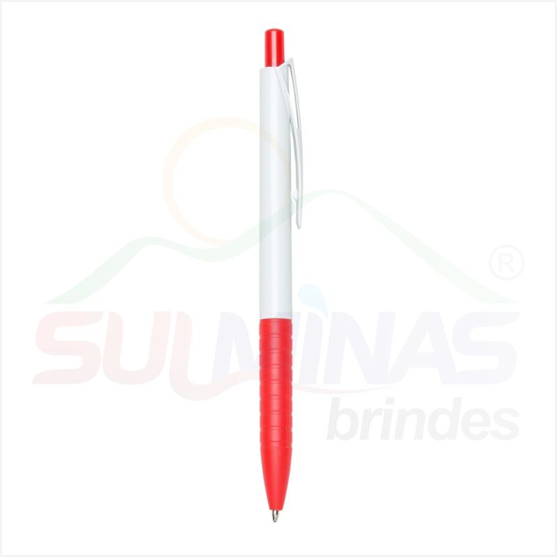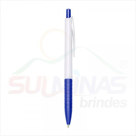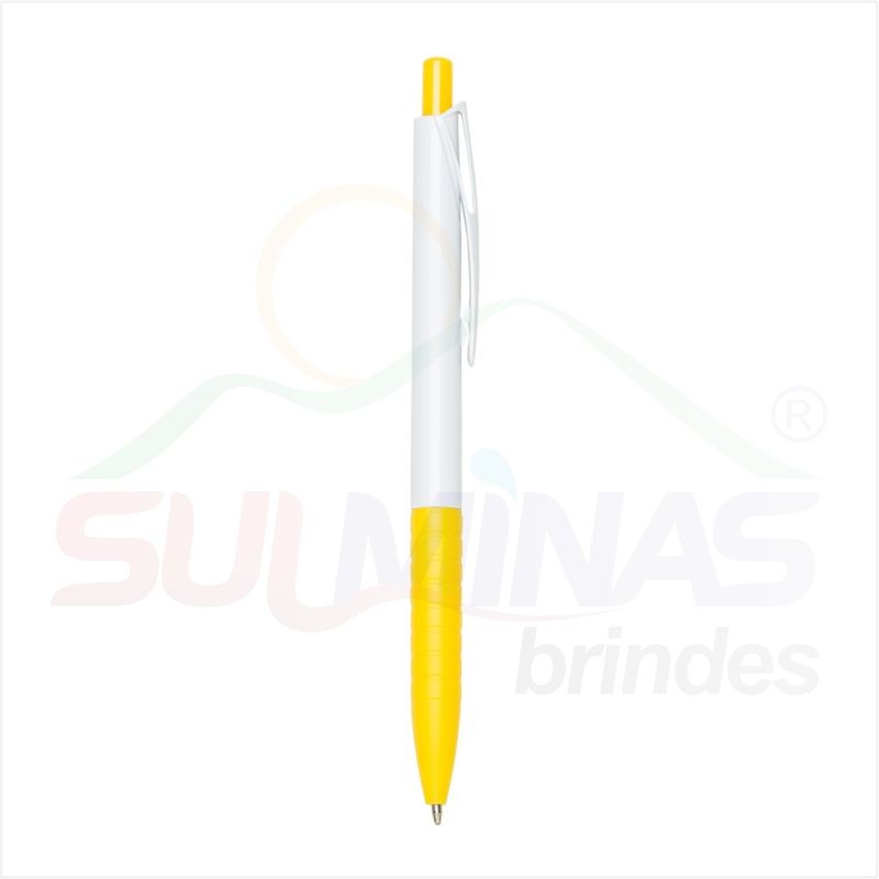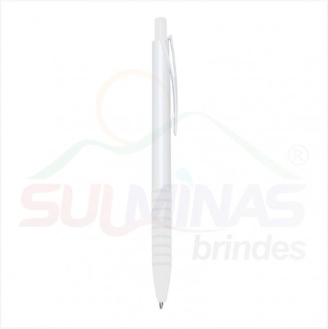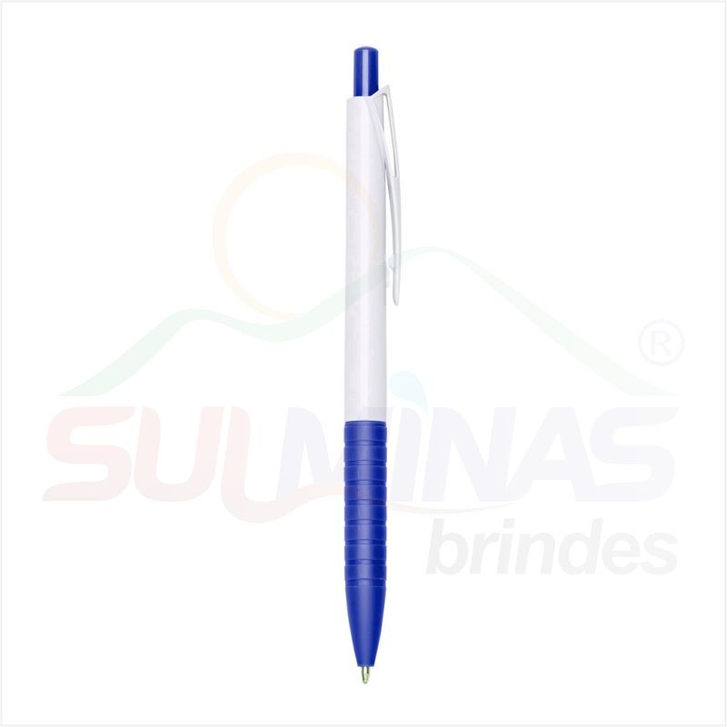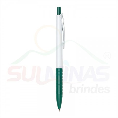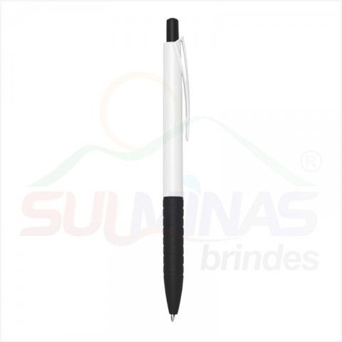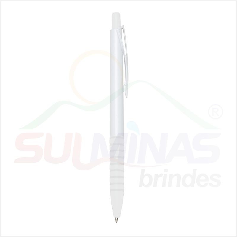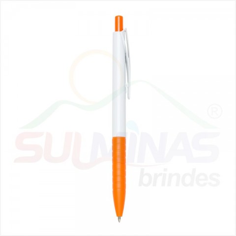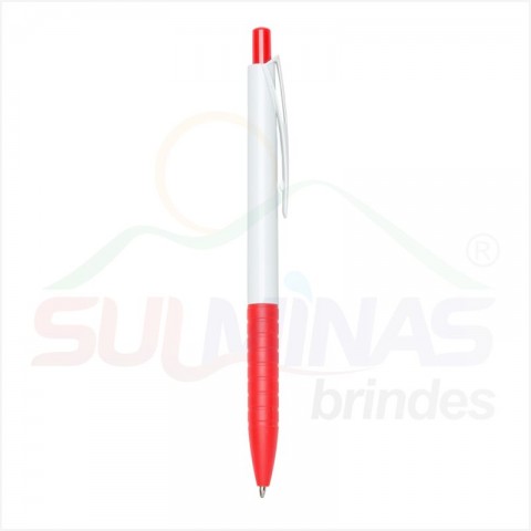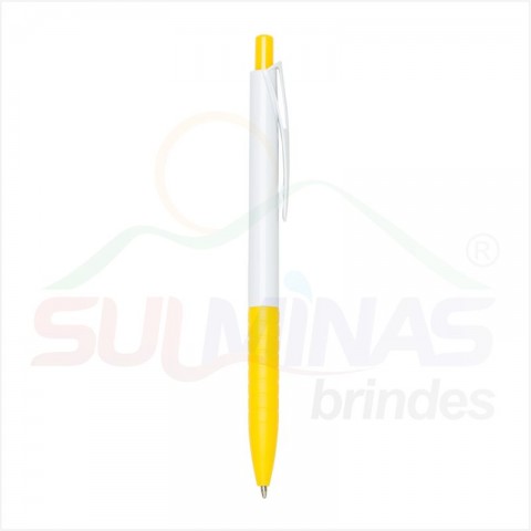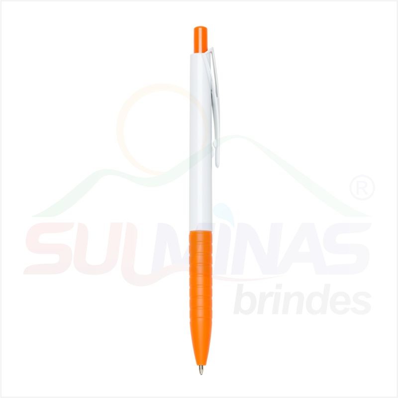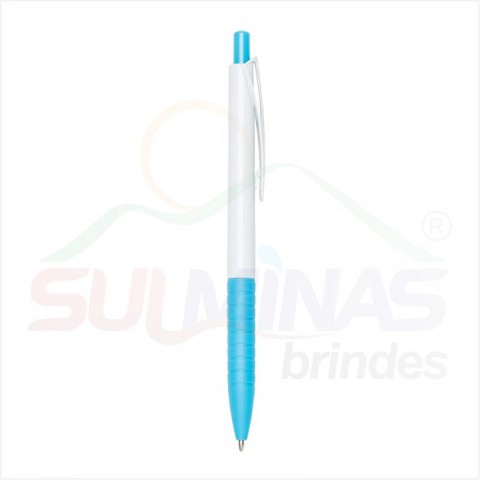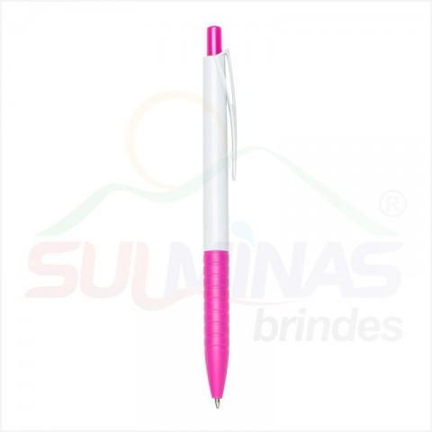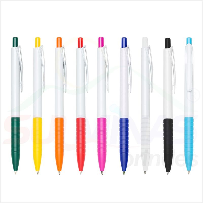 Caneta plástica branca com detalhes coloridos. Clip plástico com detalhe vazado nas laterais, acionador e parte inferior colorida com oito anéis em relevo. Aciona por clique.