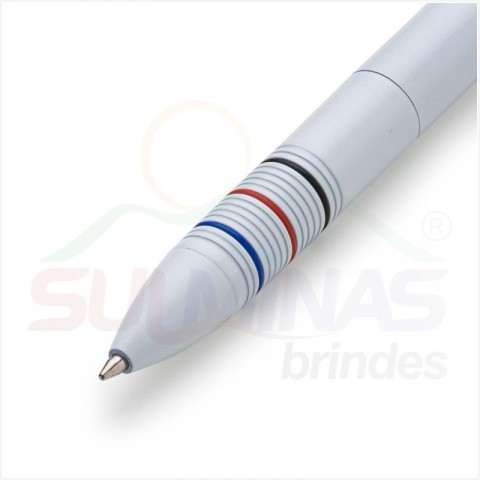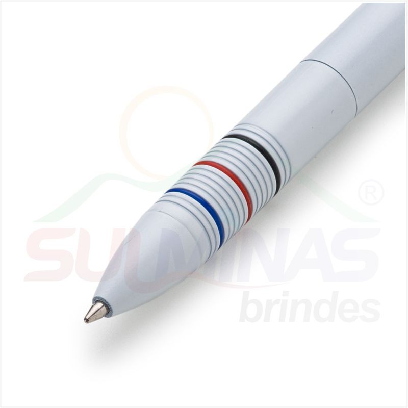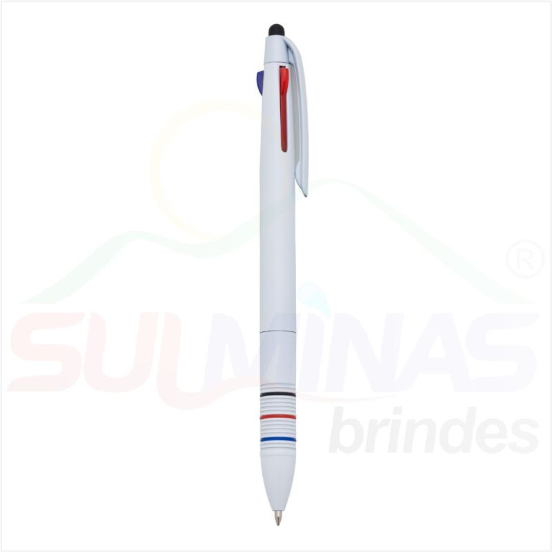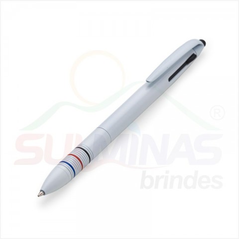 Caneta plástica três cores e ponteira touch, corpo branco com detalhes coloridos. Possui as cargas azul, preto e vermelho(basta descer o suporte colorido pra acionar a cor). Clip plástico e touch superior, possui anéis preto, vermelho e azul na parte inferior em relevo.