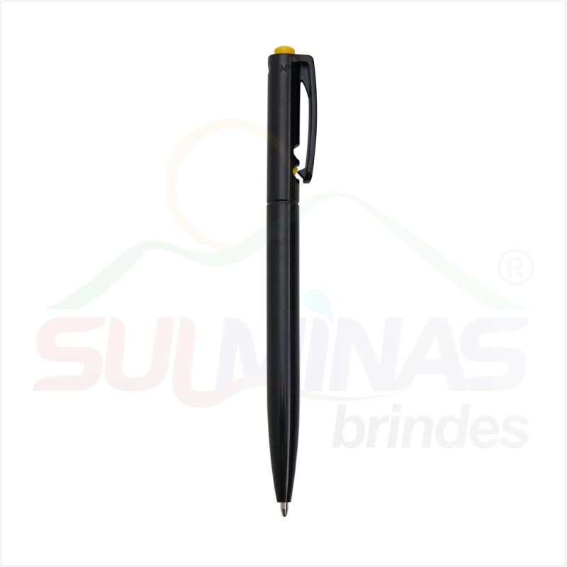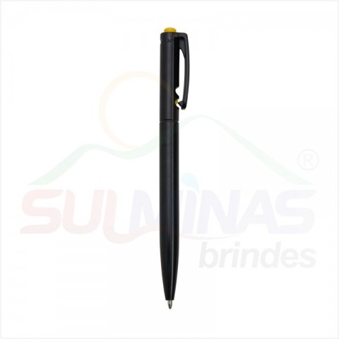 Caneta plástica preta com detalhes coloridos no acionador e destravador. Possui um furo no lado oposto do clip e anel central em relevo. Aciona por clique.