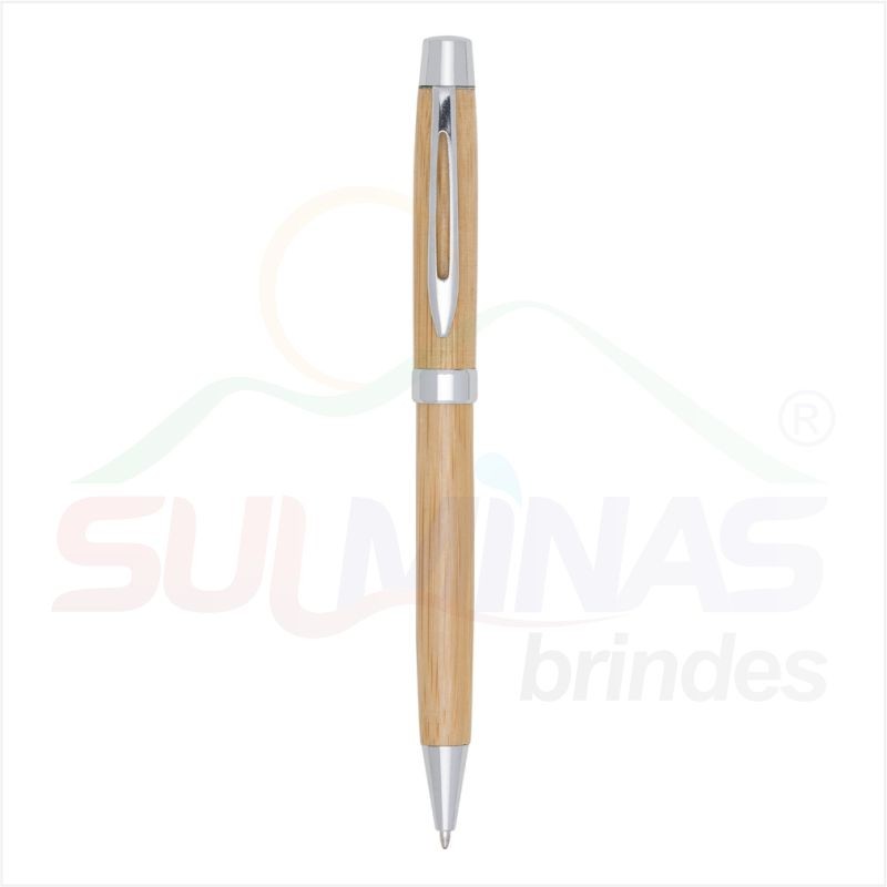 Caneta de bambu com detalhes prata, clip de metal com uma reta vazada no centro. Detalhes de relevo no anel, aciona por giro.