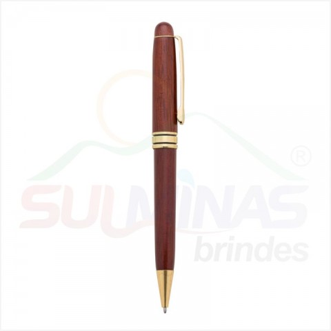Caneta de madeira com anel e detalhes dourados, clip de metal. Aciona por giro.