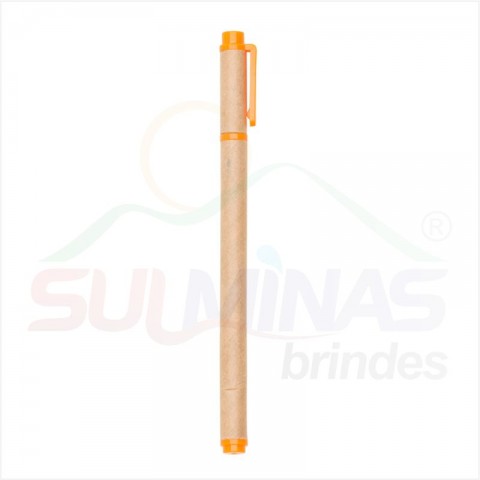 Caneta ecológica roller. Caneta de material kraft com tampa, possui clip plástico colorido, anel e parte inferior plástica colorida.