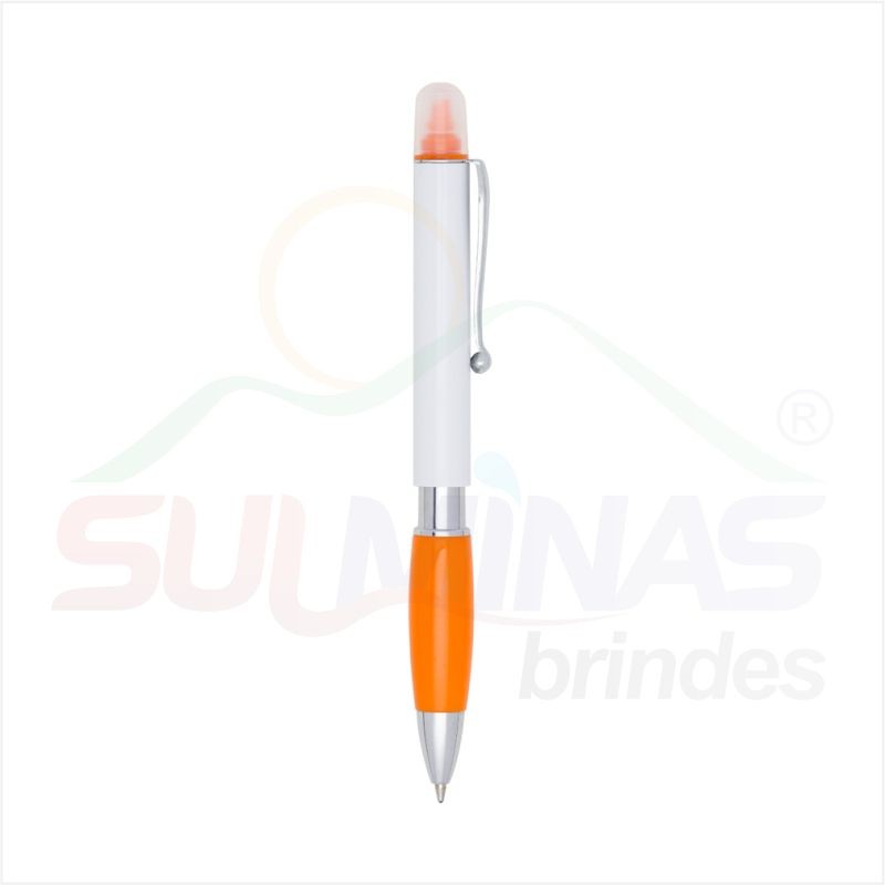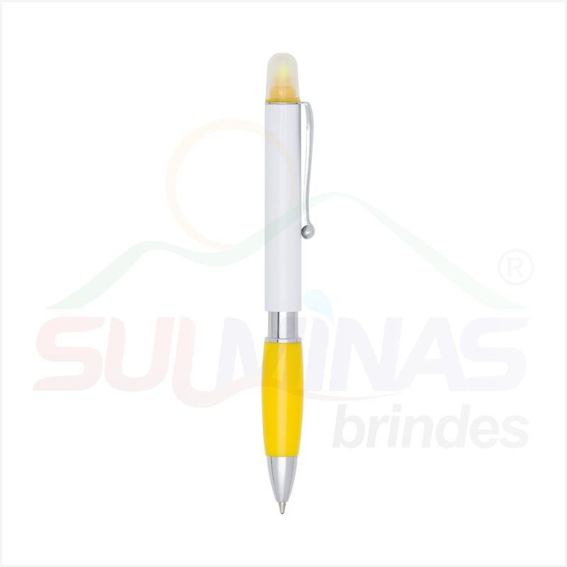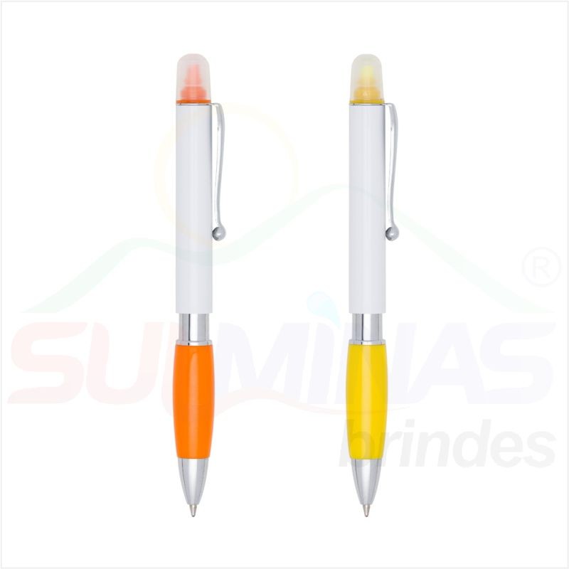 Caneta plástica marca texto com corpo branco e detalhes coloridos. Possui clip de metal e marca texto com tampa protetora, design prata entre o corpo e o detalhe colorido inferior.