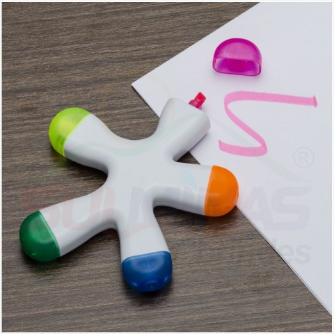 Caneta marca texto em formato splash na cor branca de frente e verso liso, possui as cores: azul, amarelo, laranja, rosa e verde.