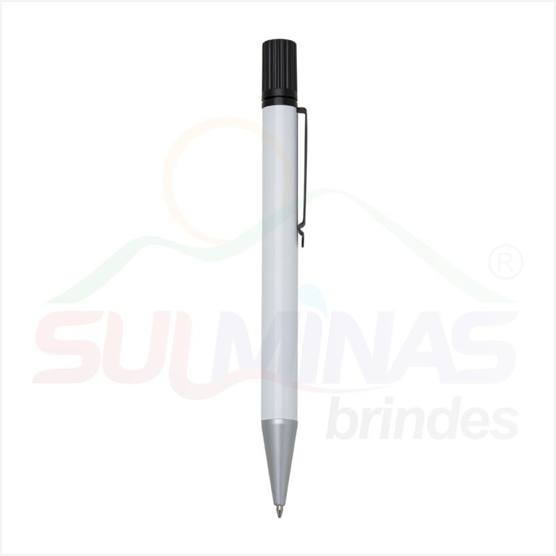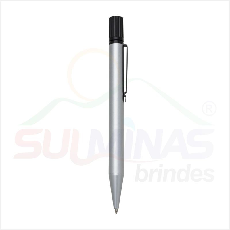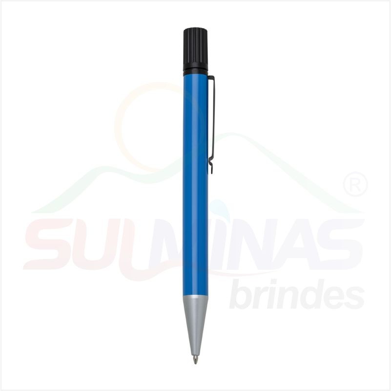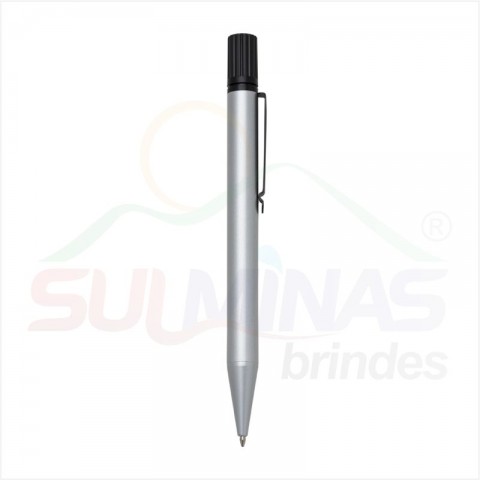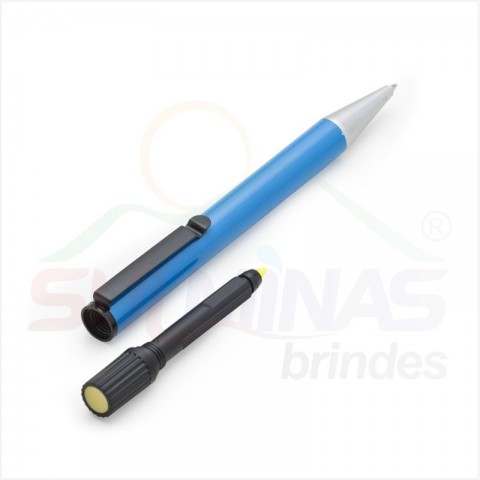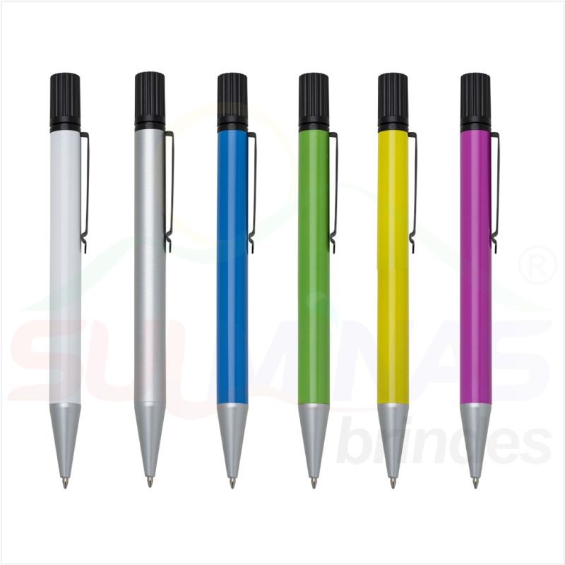 Caneta metal inteira colorida com marca texto. Clip de metal preto, para utilizar o marca texto basta desrosquear a tampa superior (possui relevo e detalhe amarelo na ponta). Esferográfica aciona segurando a ponteira e girando a caneta.