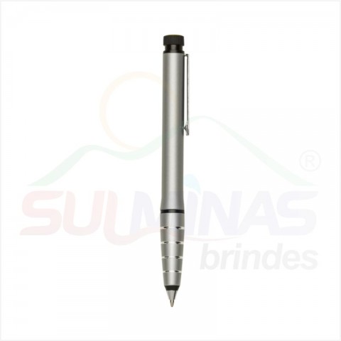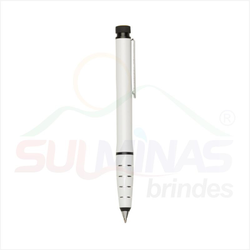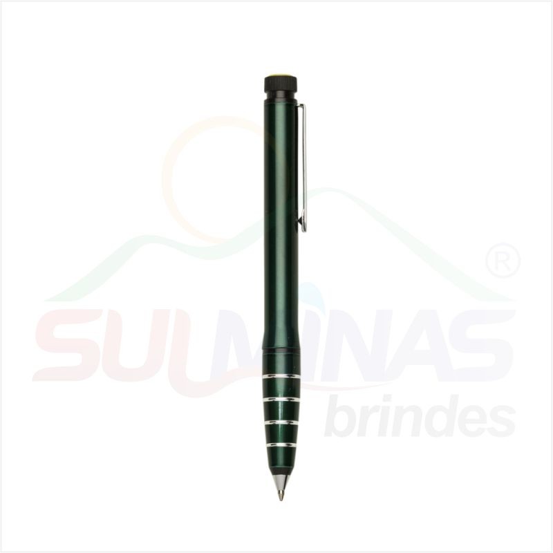 Caneta metal com marca texto, corpo colorido com detalhes em prata e preto. Clip metal prata, possui um marca texto na ponta superior em preto com detalhe amarelo, basta rotacionar para utilizar o marca texto. Possui um anel inferior preto e abaixo quatro anéis prata. Aciona por giro.