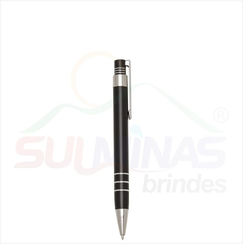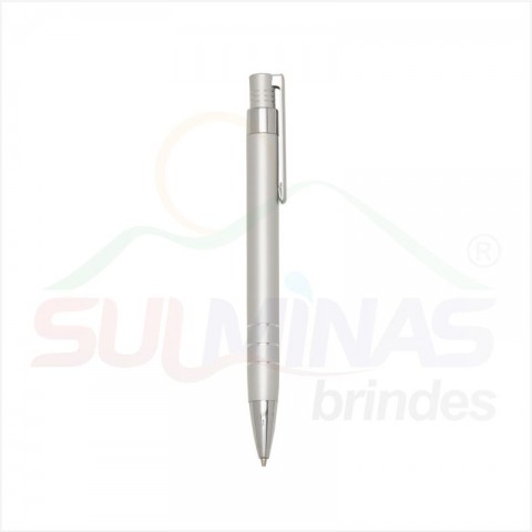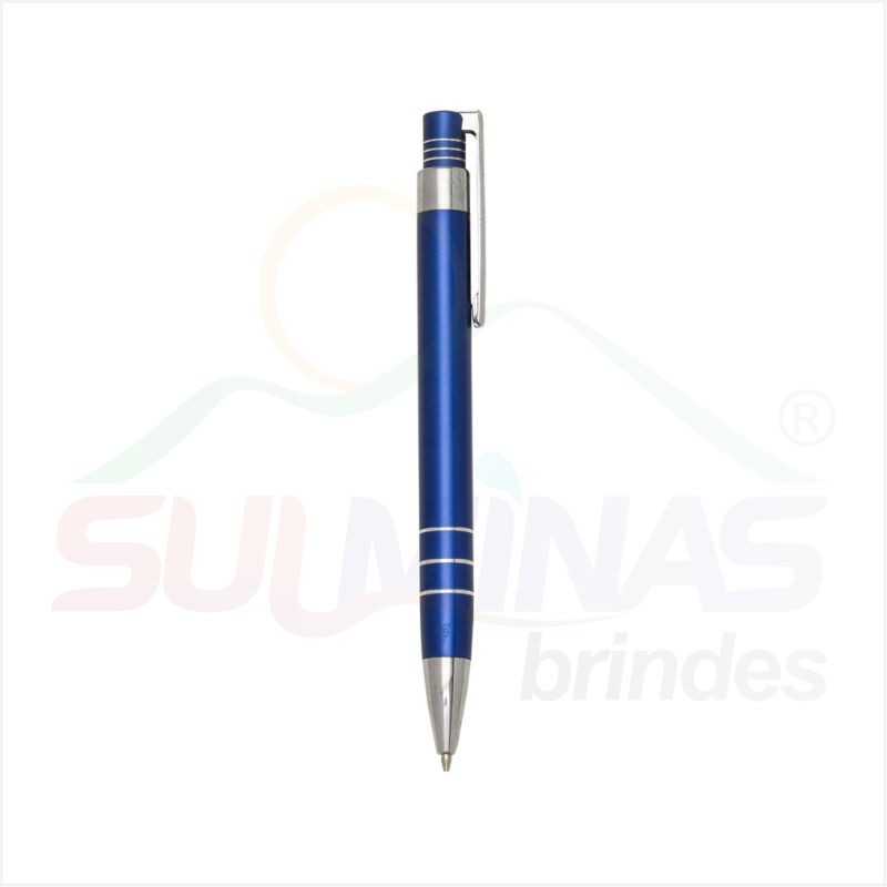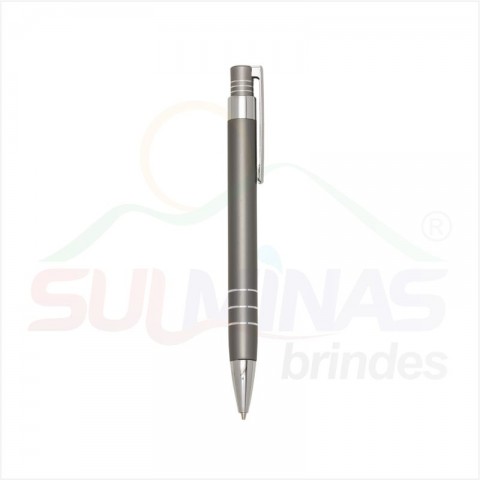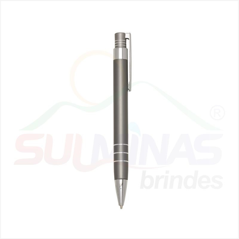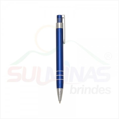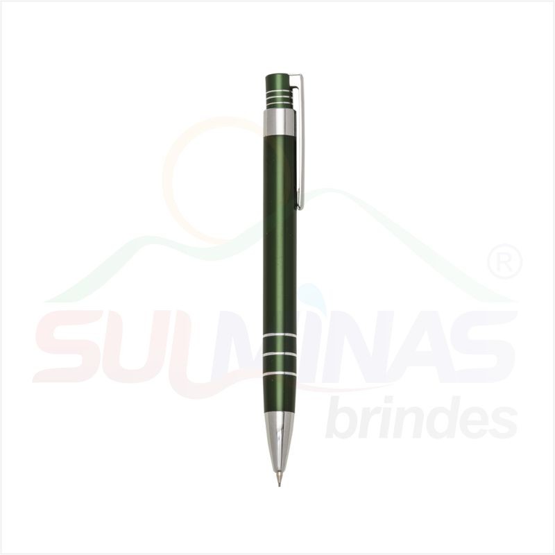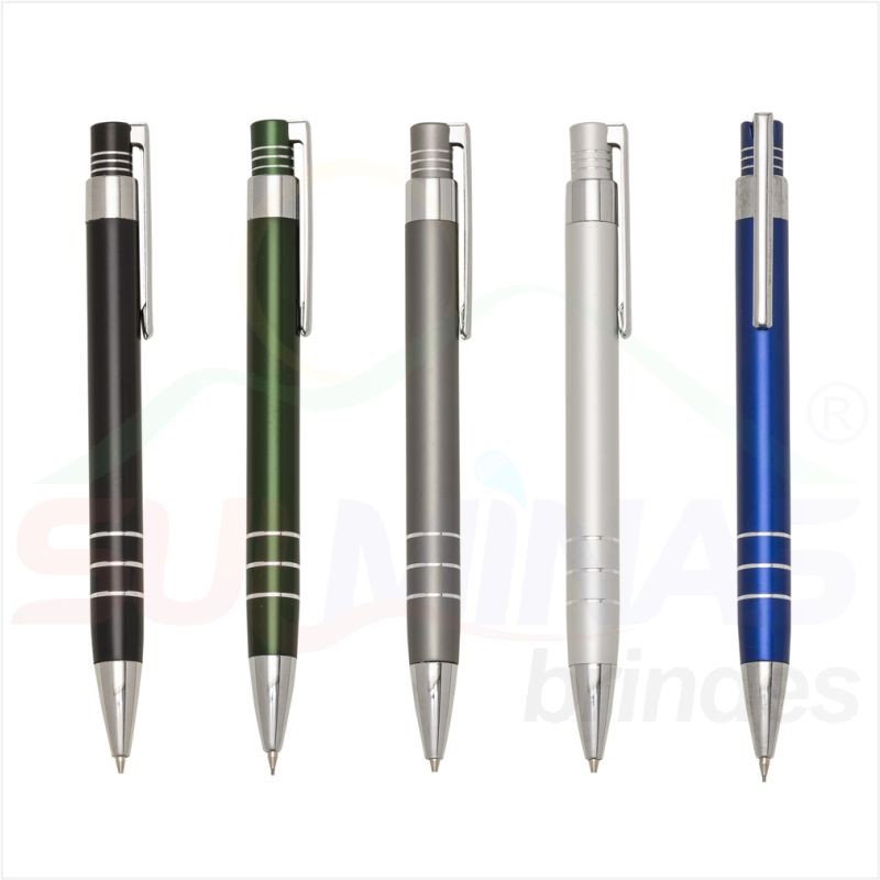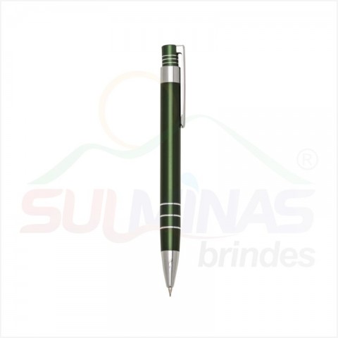 Lapiseira metal inteira colorida com detalhes prata. Clip metal e com três anéis na parte superior e outros três na parte inferior. Aciona por clique.