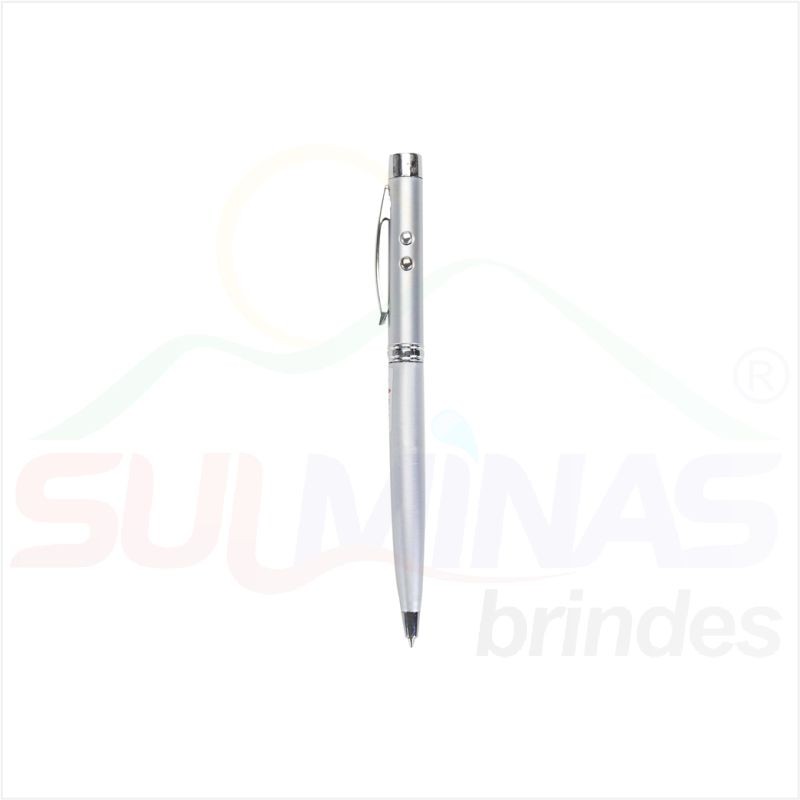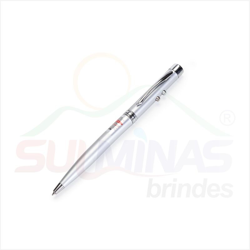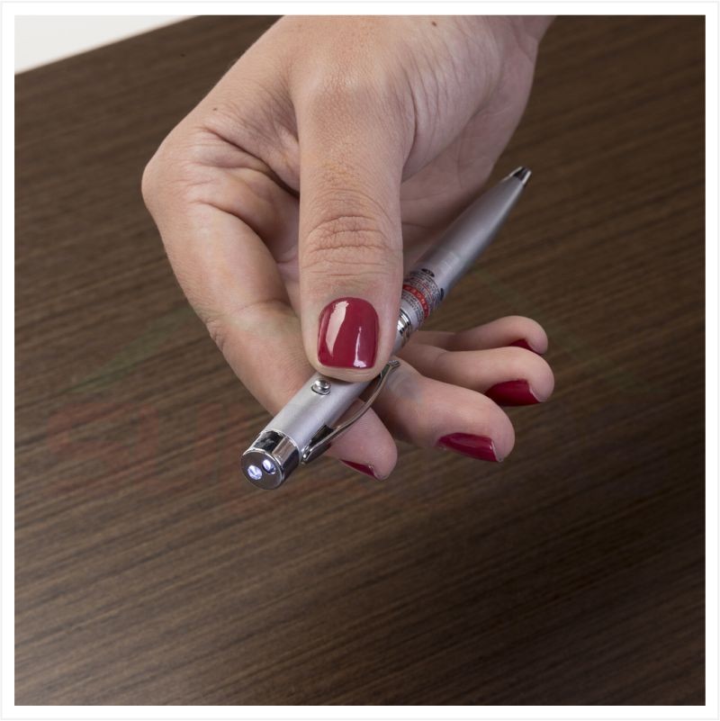 Caneta laser com estojo de madeira. Esferográfica, laser e led (basta apertar os botões), possui clip de metal, abaixo do anel central contém um adesivo de alerta. Estojo em madeira revestido com espuma interna. Caneta aciona por giro.