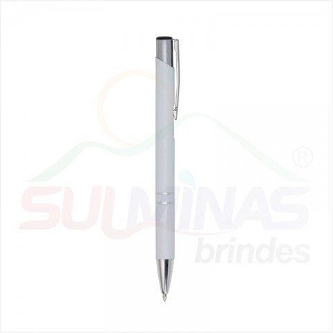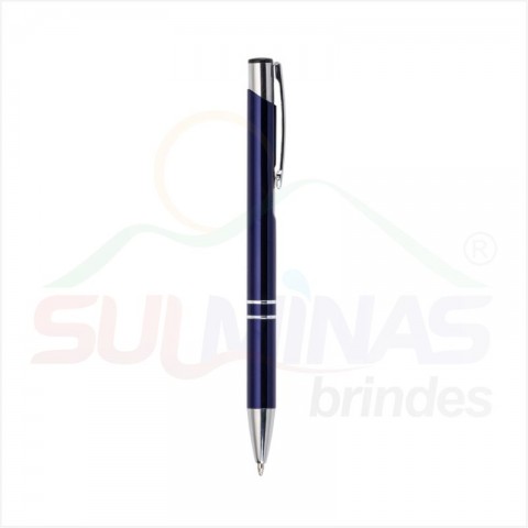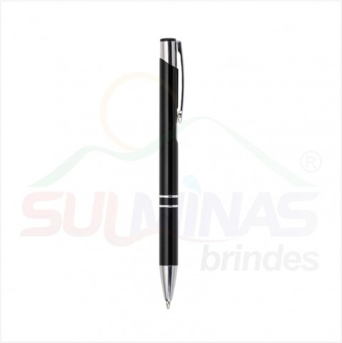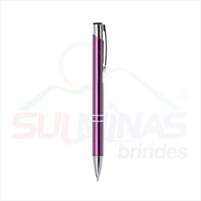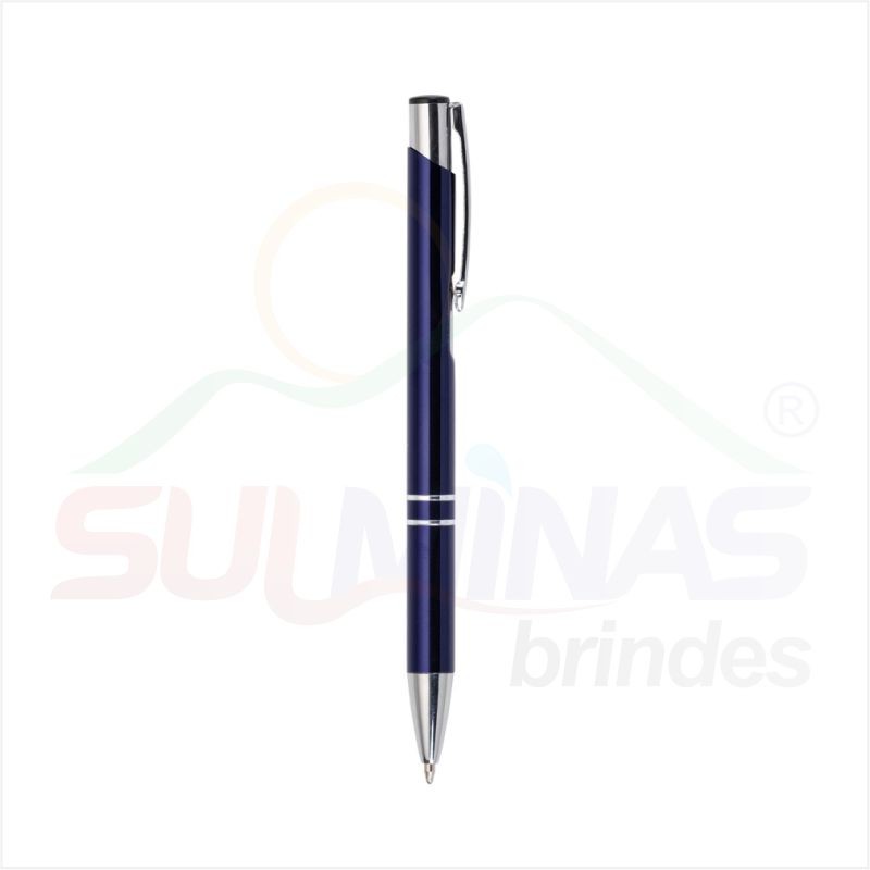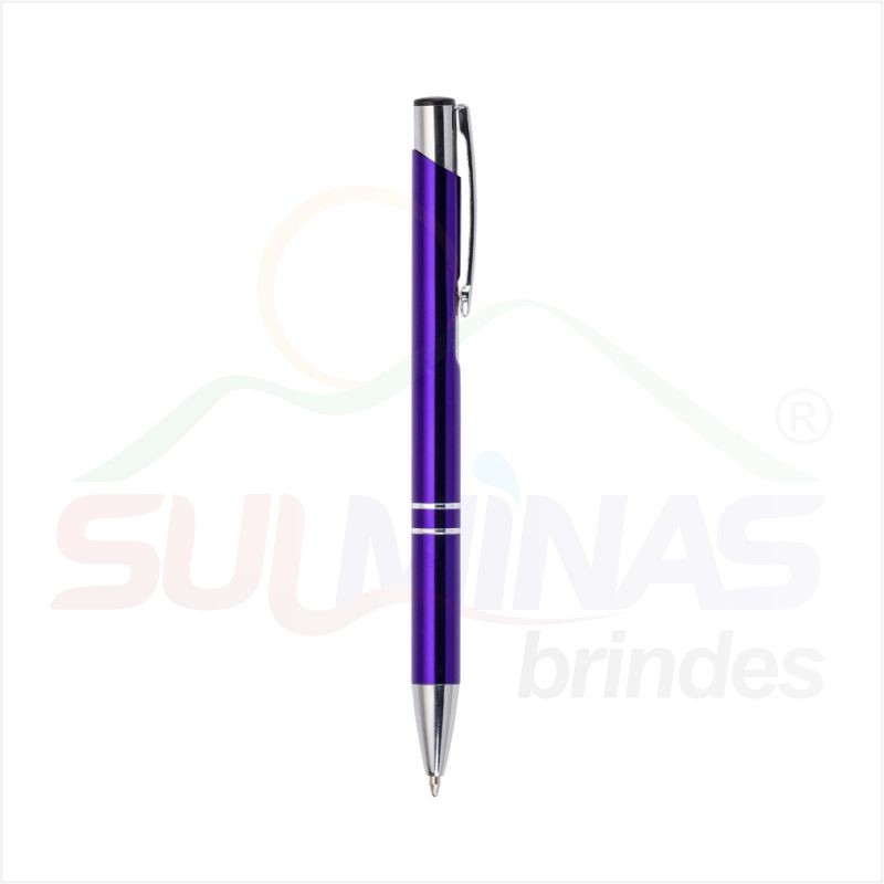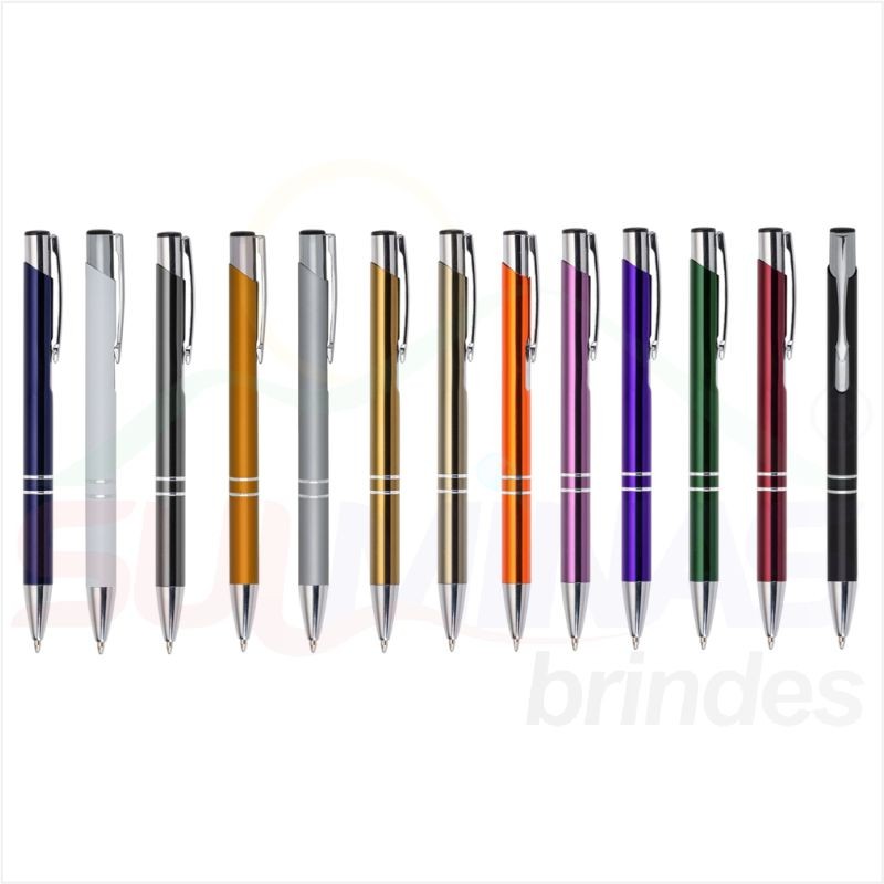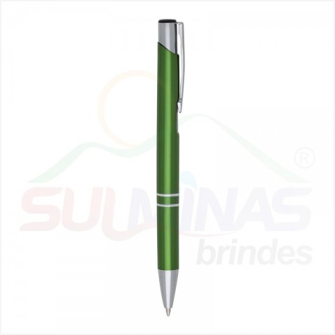 Caneta metal inteira colorida com detalhes prata. Clip metal com a ponta do acionador preto, parte inferior com dois anéis prata. Aciona por clique.