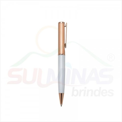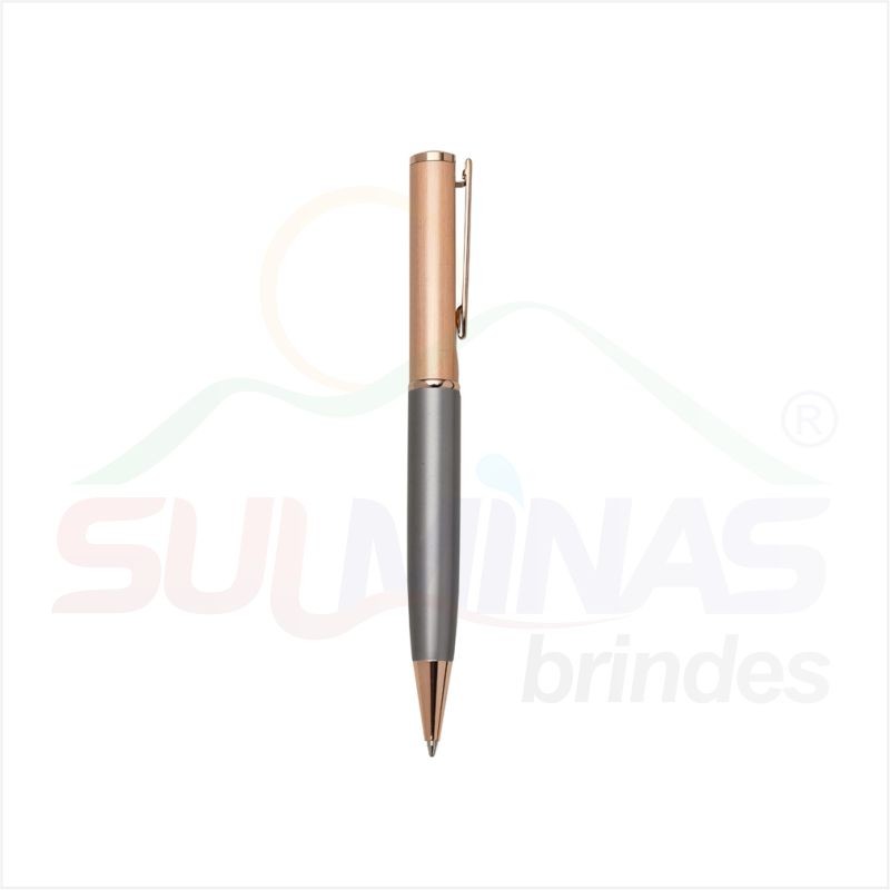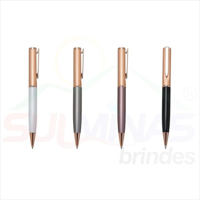 Caneta metal cobre com detalhe inferior colorido. Clip metal com e detalhe circular na ponta superior, possui anel central e aciona por giro.