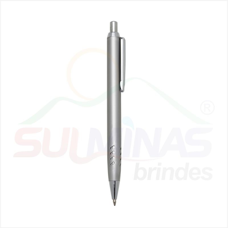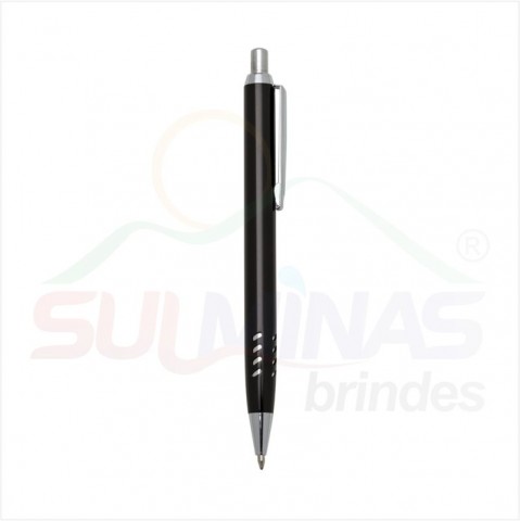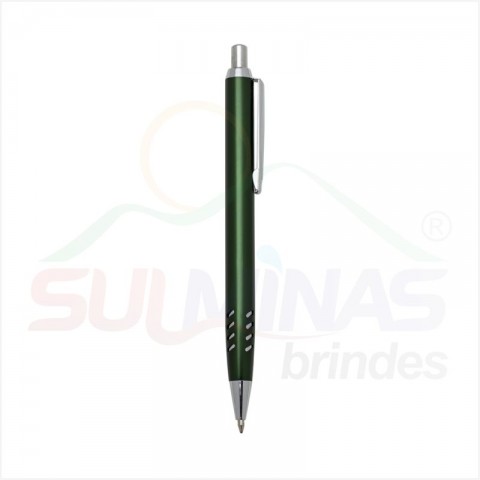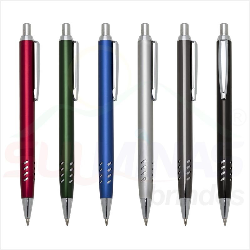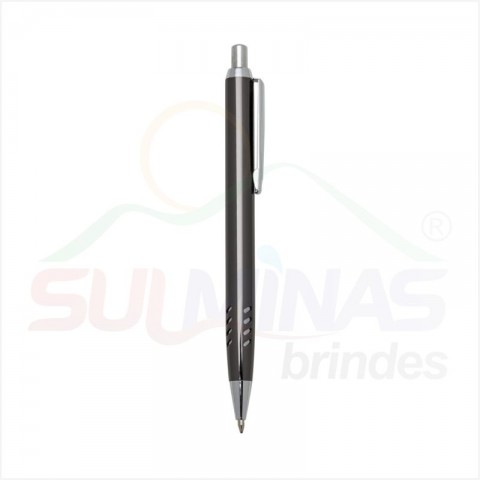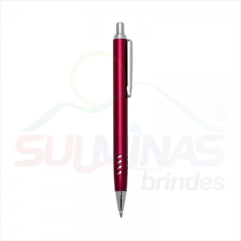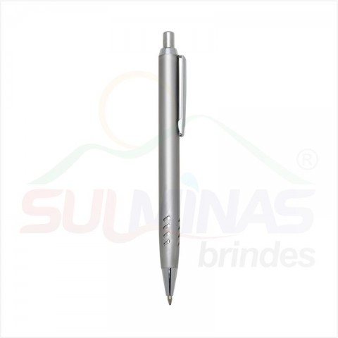 Caneta metal inteira colorida com detalhes prata. Clip metal, possui dezesseis “traços” prata na parte inferior. Aciona por clique.