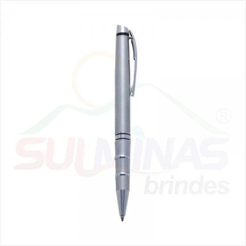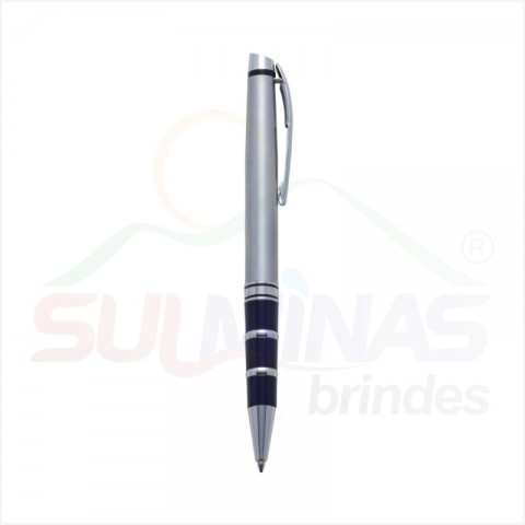 Caneta metal inteira prata com detalhes coloridos. Possui clip de metal com anel superior colorido, anel central prata com relevo e três detalhes coloridos entre dois anéis inferiores. Aciona por giro.