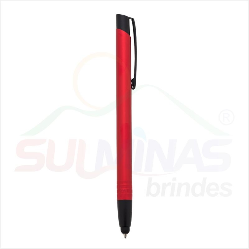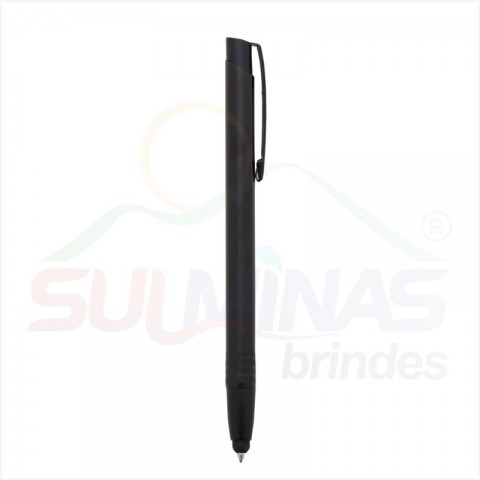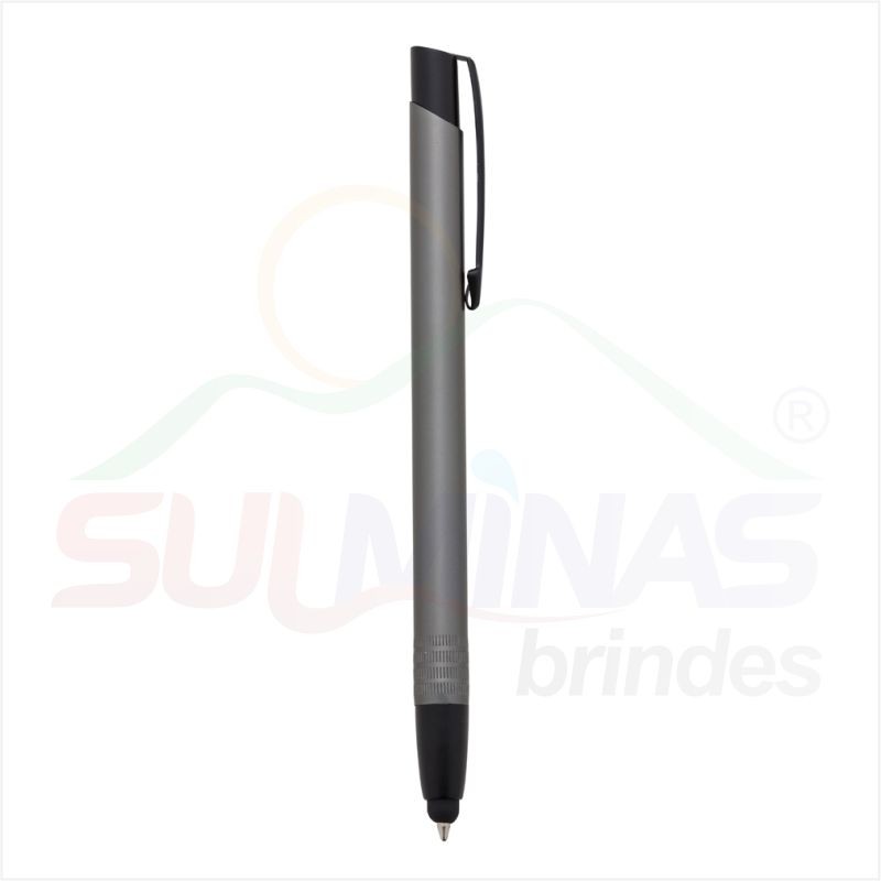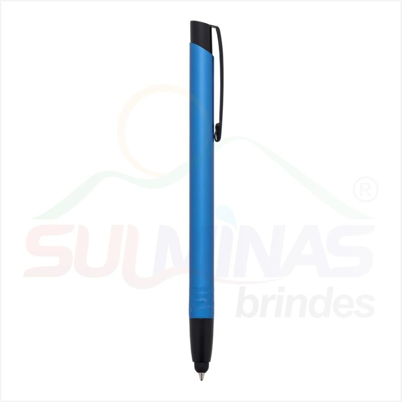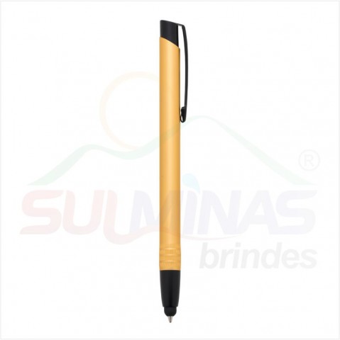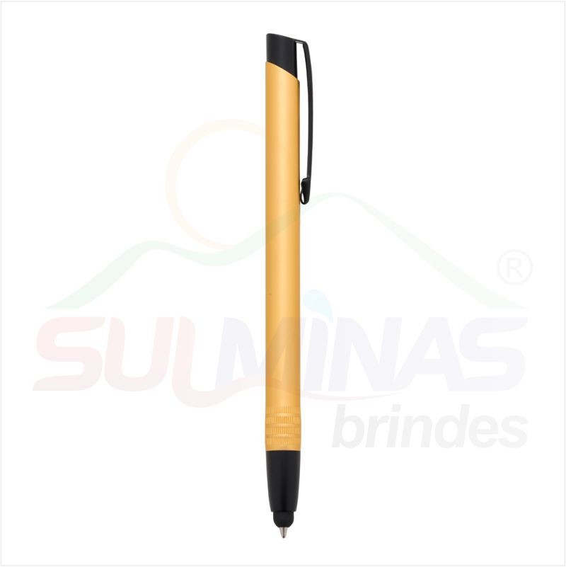Caneta de metal colorida com detalhes preto e ponteira touch. Clip de metal, parte inferior possui quatro “anéis” em relevo. Aciona por clique, esferográfica sai por dentro da borracha touch.