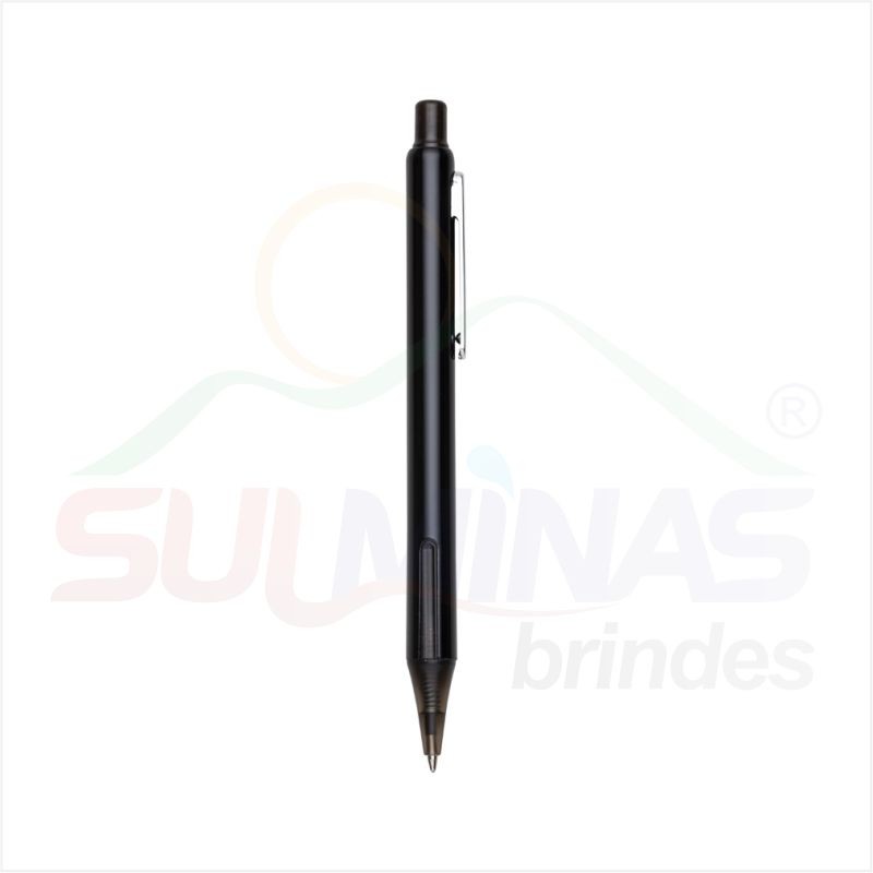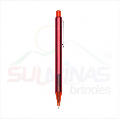 Caneta semi-metal inteira colorida com detalhe prata. Possui clip metal prata e dois detalhes na parte inferior. Aciona por clique.