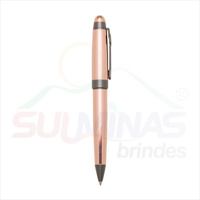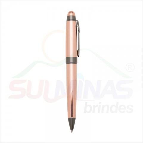 Caneta metal com detalhes coloridos. Clip metálico com formato de um brasão na parte superior, possui anel superior, central e ponteira colorida. Aciona por giro.