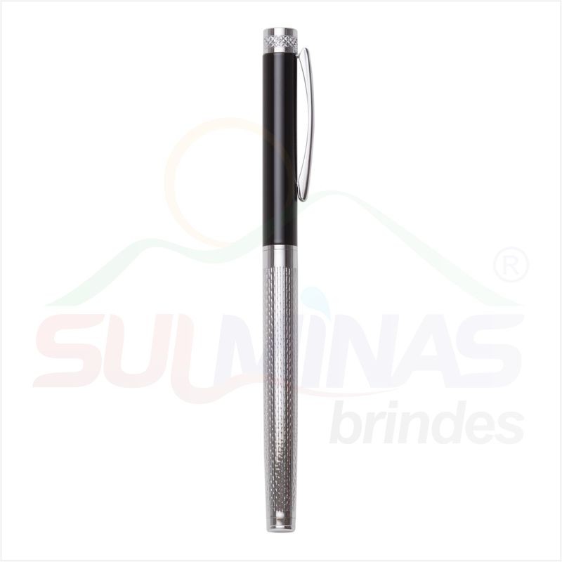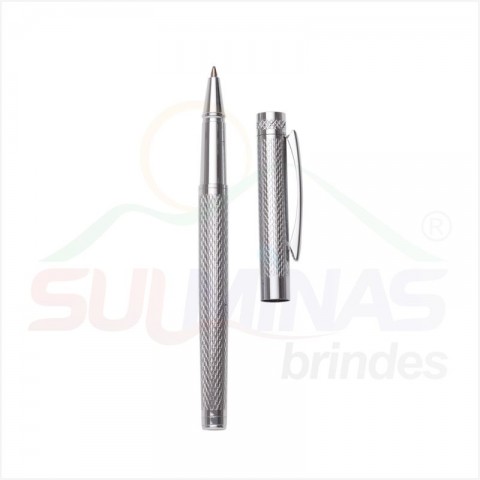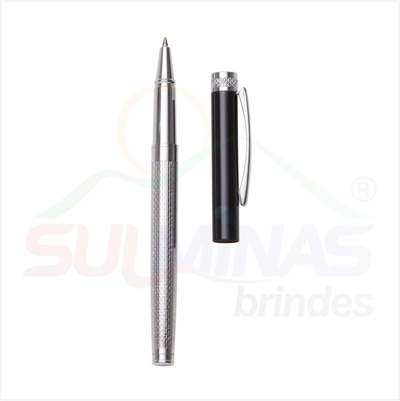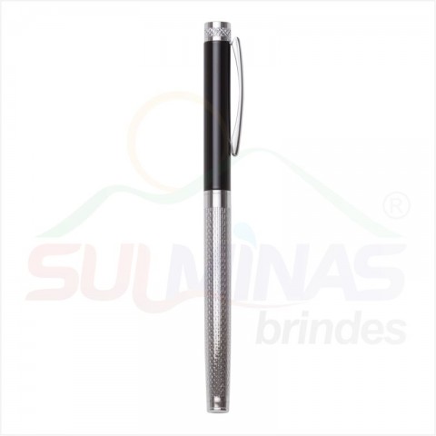 Caneta metal roller prata com detalhes coloridos. Parte inferior e parte superior da tampa com detalhes texturizados, clip metal. Basta puxar a tampa para utilização.