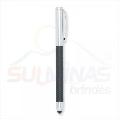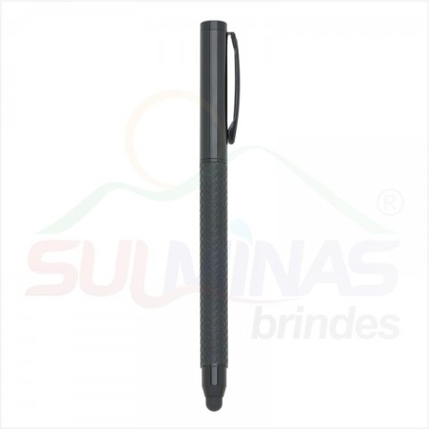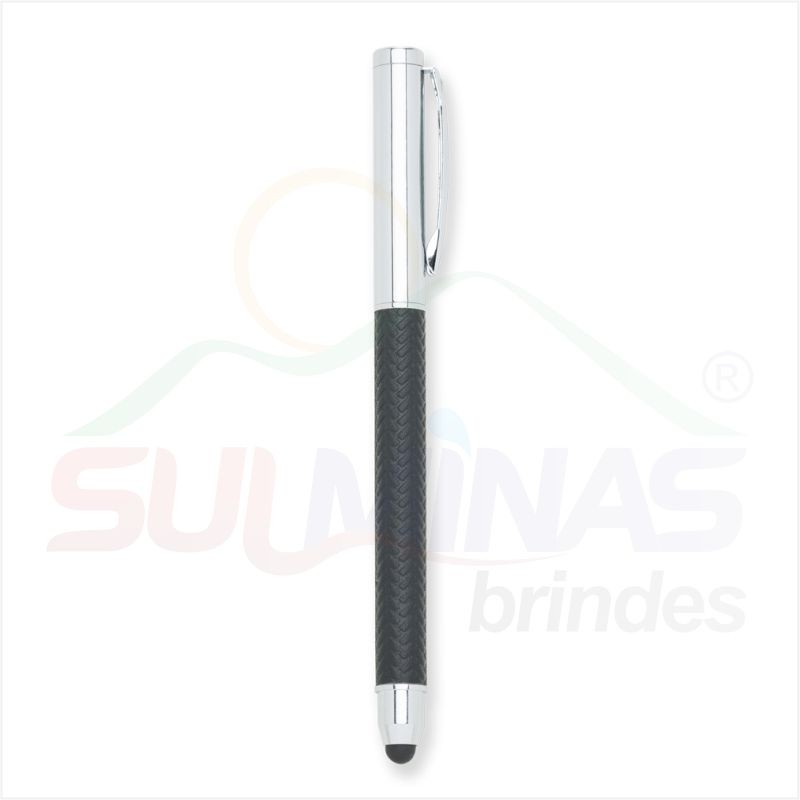 Caneta metal com detalhe em couro sintético e borracha touch. Caneta metálica com tampa, possui a parte inferior em couro sintético texturizado e borracha touch inferior.