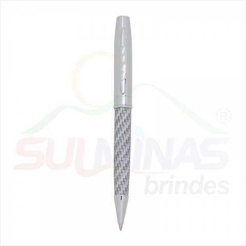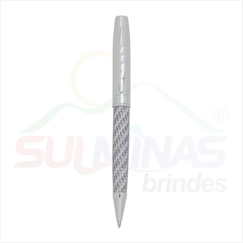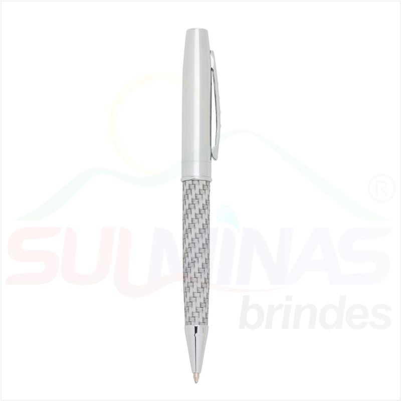 Caneta metal prata brilhante com detalhe trançado. Clip metálico com 4 “bolinhas” em relevo, parte inferior com detalhe em aço trançado. Aciona por giro.
