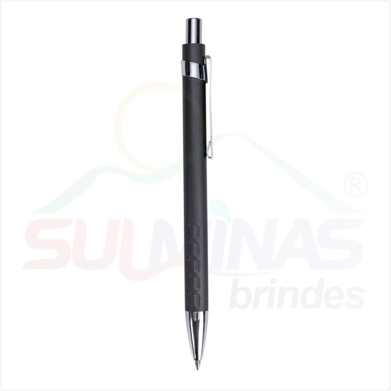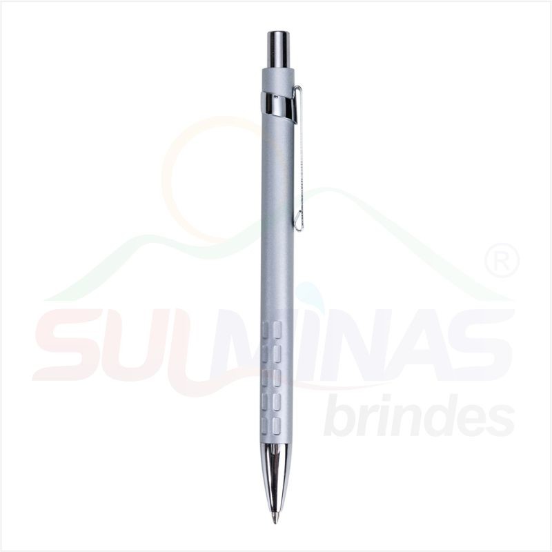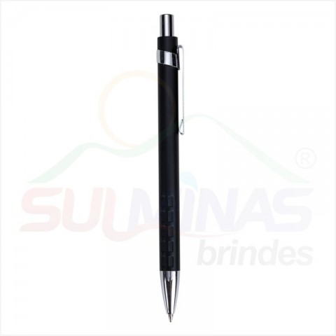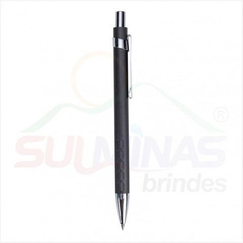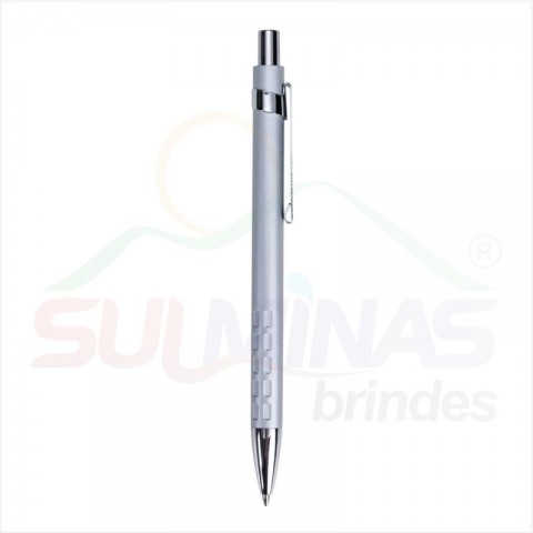 Caneta metal com detalhes retangulares na parte inferior em relevo. Corpo colorido com pintura fosca, acionador e clip prata espelhado, aciona por clique.