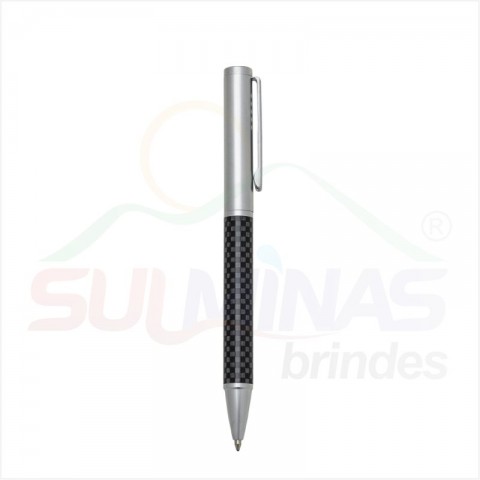 Caneta metal executiva prata fosca com detalhes. Clip metal com cinco furos e aciona por giro.
