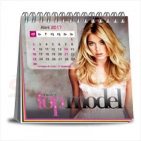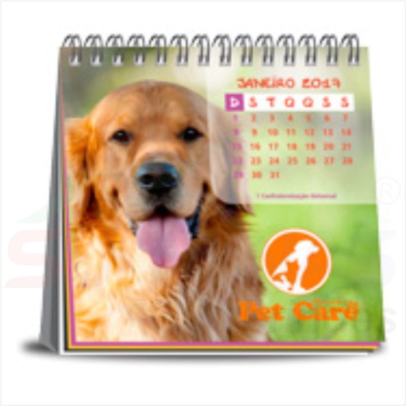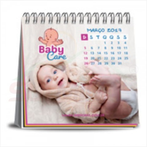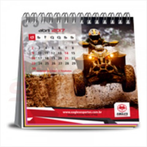 Calendário de mesa wire-o com 6 lâminas (12 páginas) em papel couchê 150g com impressão 4x4 cores. Base em papel couchê 300g sem impressão.