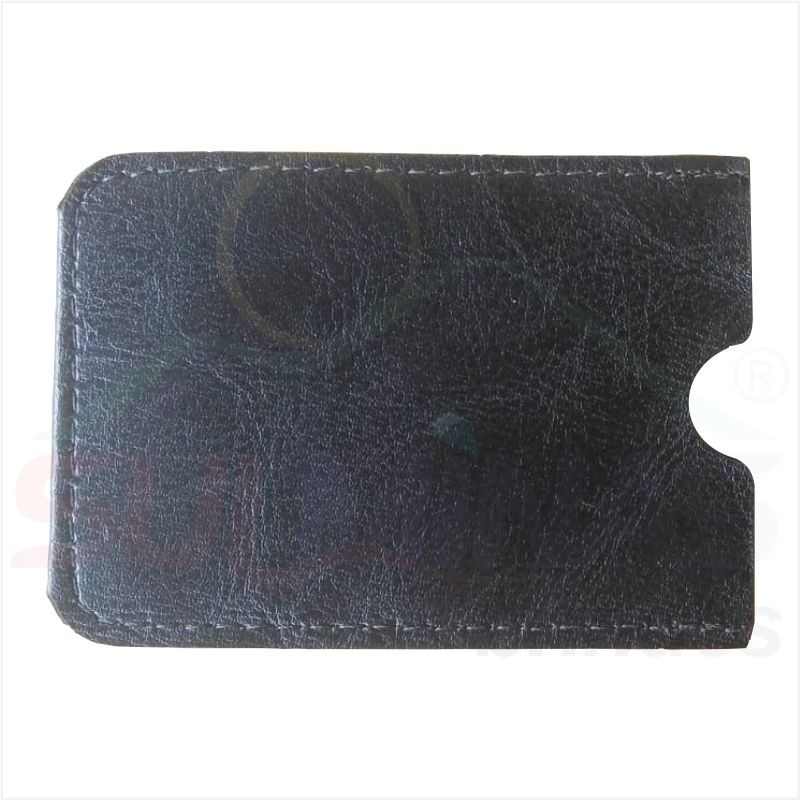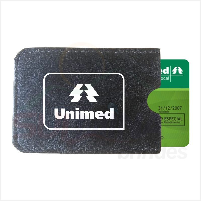 Porta cartão de crédito e cartão de plano de saúde produzido em couro sintético com puxador lateral.