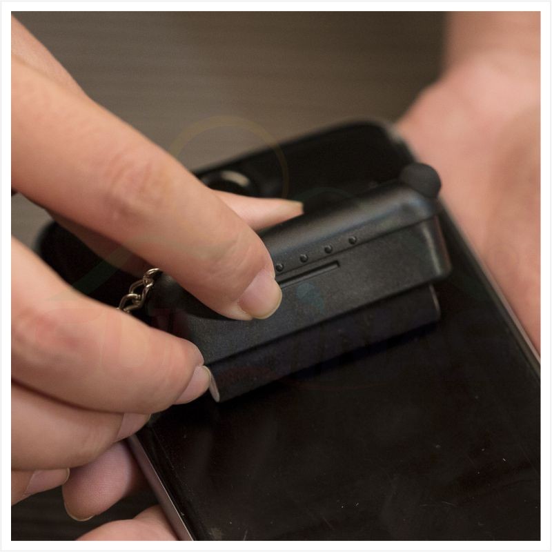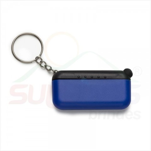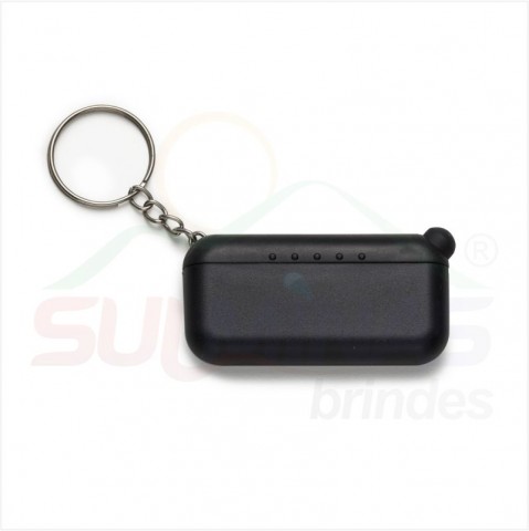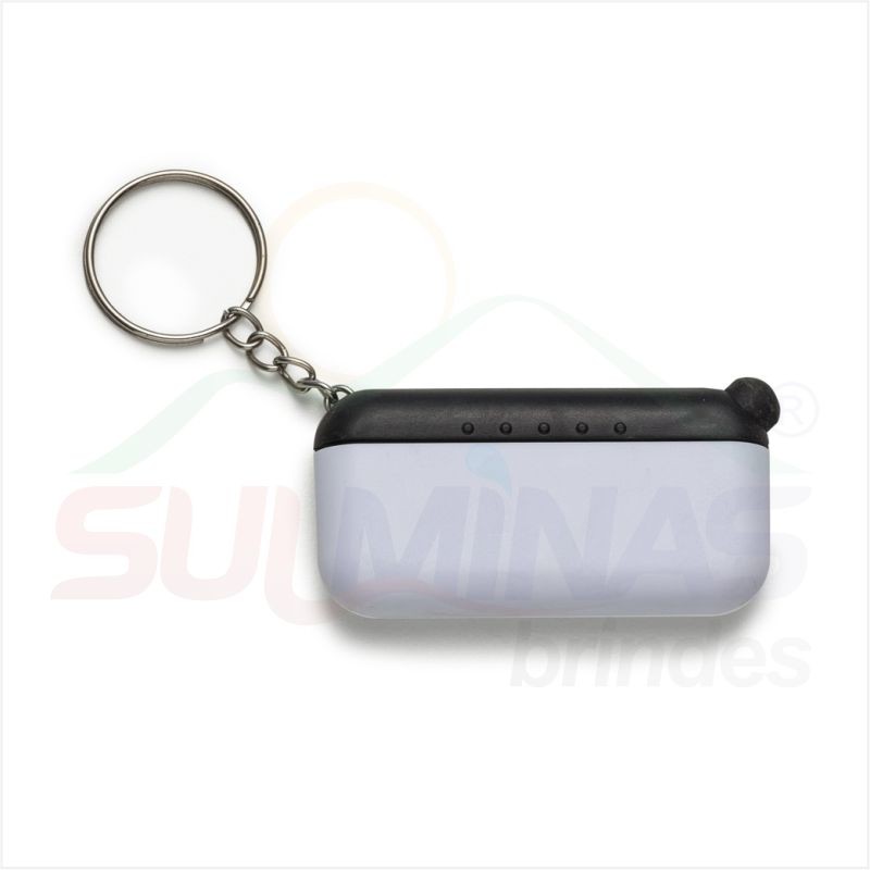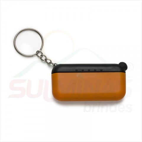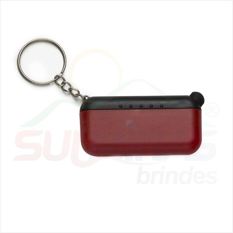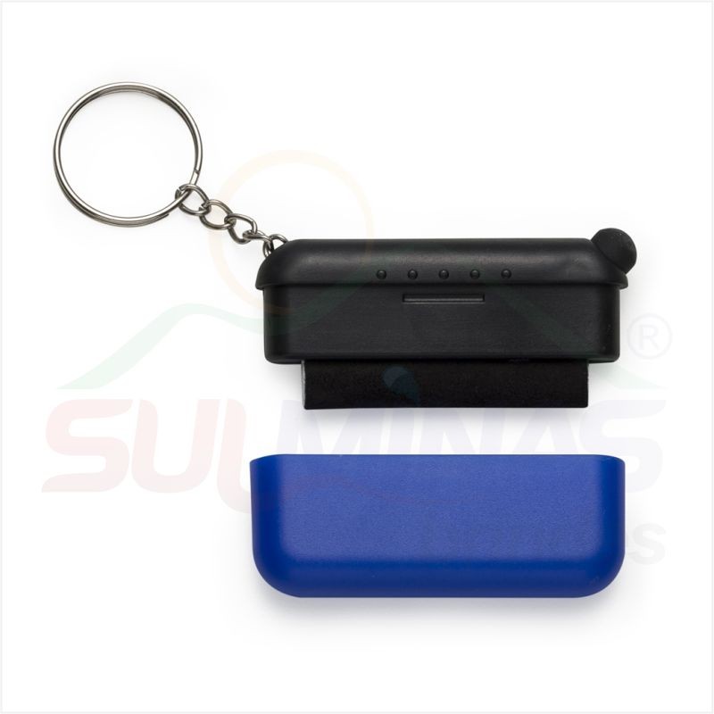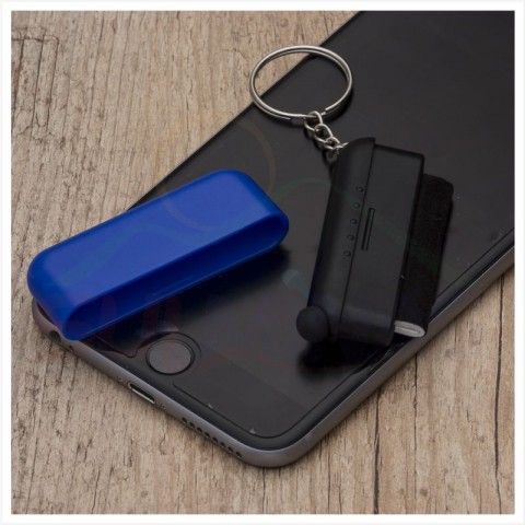 Chaveiro plástico limpador de tela e com ponta touch. Possui cinco bolinhas na parte preta em cada verso, para utilizar o limpador basta tirar a tampa colorida.