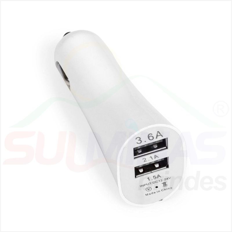 Carregador veicular de plástico na cor branca com detalhes prata. Entrada 12-24V e Saídas de 1.0A e 2.1A. Basta encaixar na tomada acendedor do carro e conectar à um cabo USB (não acompanha).